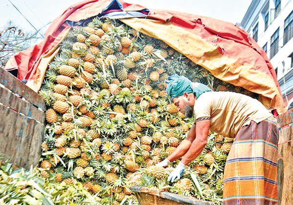 রাজধানীর পুরান ঢাকার শ্যামবাজার পাইকারি আড়তে বিক্রির জন্য ট্রাকে করে নিয়ে আসা হয়েছে মৌসুমি ফল আনারস। ছবিটি গতকাল সকালে তোলা * আলোকিত বাংলাদেশ