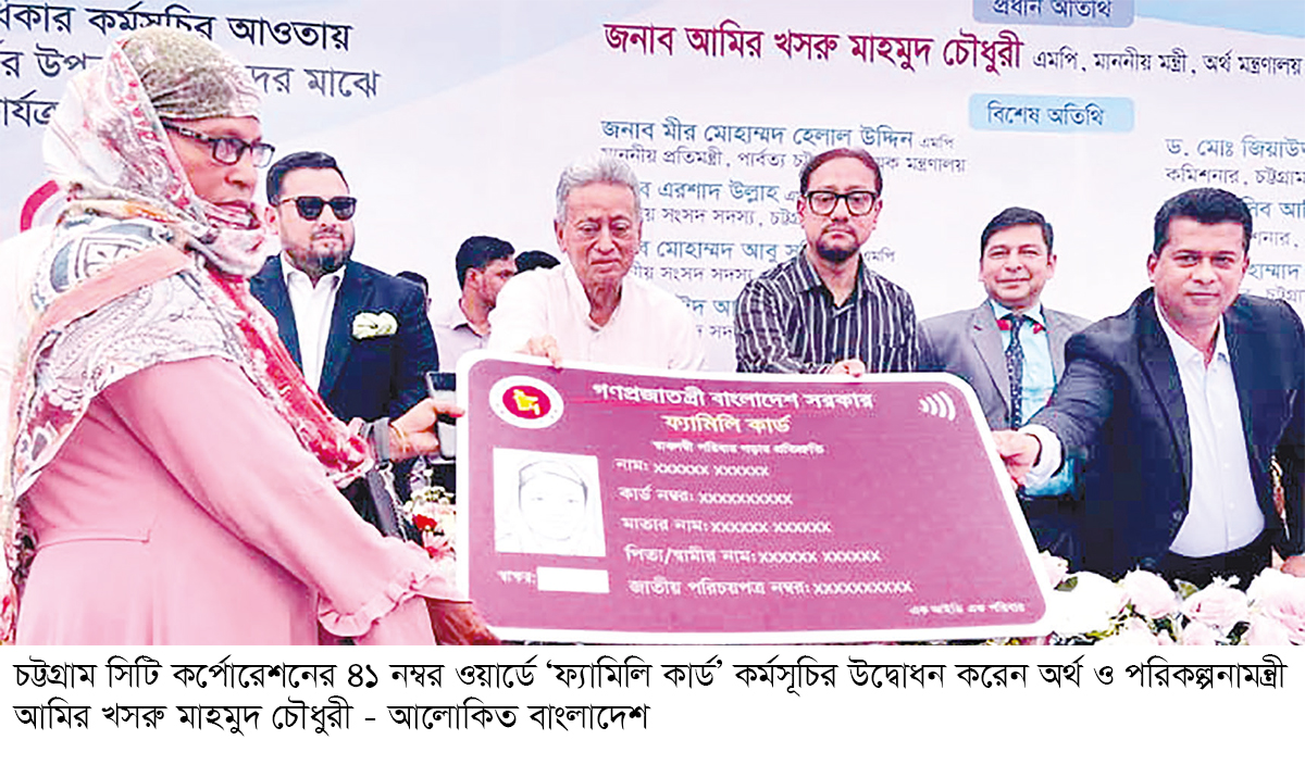 চট্টগ্রাম নগরের ৪১ নম্বর ওয়ার্ডে ৫ হাজার ৫৭৫টি পরিবারের মধ্যে ‘ফ্যামিলি কার্ড’ বিতরণের মাধ্যমে নতুন সামাজিক সুরক্ষা কর্মসূচি শুরু হয়েছে। এই কার্ডের মাধ্যমে উপকারভোগী পরিবারের ব্যাংক হিসাবে প্রতি কিস্তিতে সরাসরি ২ হাজার ৫০০ টাকা করে সহায়তা দেওয়া হবে। গতকাল মঙ্গলবার সকালে পতেঙ্গা বিমানবন্দর উচ্চ বিদ্যালয় মাঠে আয়োজিত অনুষ্ঠানে এ কর্মসূচির উদ্বোধন করেন অর্থ ও পরিকল্পনামন্ত্রী আমির খসরু মাহমুদ চৌধুরী।
