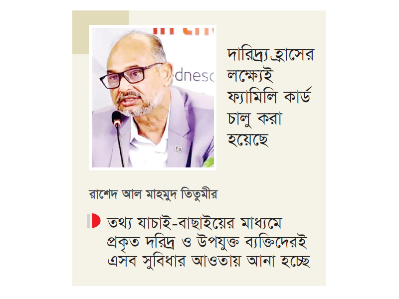 প্রধানমন্ত্রীর অর্থ ও পরিকল্পনাবিষয়ক উপদেষ্টা রাশেদ আল মাহমুদ তিতুমীর বলেছেন, ফ্যামিলি কার্ড ও কৃষক কার্ডসহ সামাজিক সুরক্ষা কর্মসূচিতে উপকারভোগী নির্বাচনে কোনো ধরনের রাজনৈতিক বিবেচনা রাখা হচ্ছে না। তথ্য যাচাই-বাছাইয়ের মাধ্যমে প্রকৃত দরিদ্র ও উপযুক্ত ব্যক্তিদেরই এসব সুবিধার আওতায় আনা হচ্ছে। গতকাল রাতে একটি বেসরকারি টেলিভিশন চ্যানেলের টকশোতে অংশ নিয়ে তিনি এসব কথা বলেন। অনুষ্ঠানে দেশের অর্থনীতি, সামাজিক সুরক্ষা কর্মসূচি, জ্বালানি খাত এবং সরকারের বিভিন্ন নীতিগত পদক্ষেপ নিয়ে বিস্তারিত আলোচনা করেন তিনি।