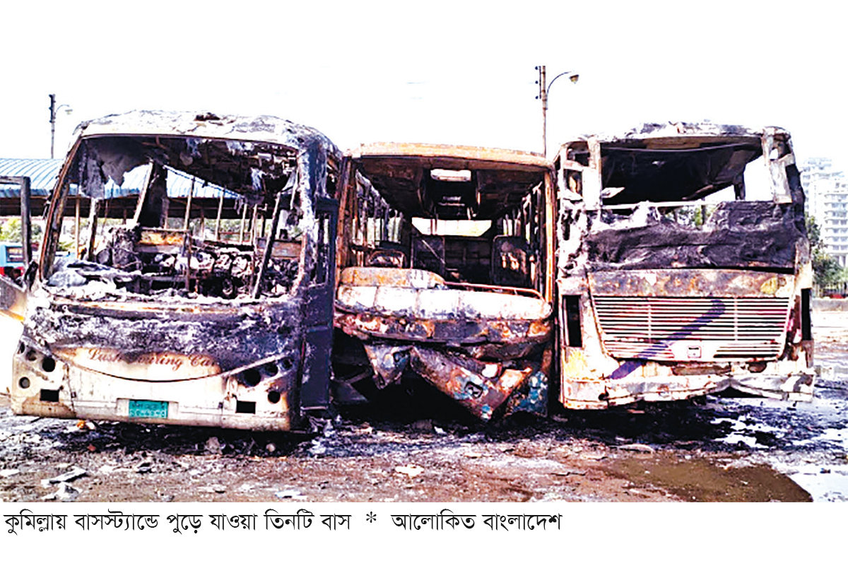 কুমিল্লায় বাসস্ট্যান্ডে দাঁড়িয়ে থাকা তিনটি বাসে অগ্নিকাণ্ডের ঘটনা ঘটেছে। এতে তিনটি গাড়িই পুড়ে গেছে। খবর পেয়ে আগুন নিয়ন্ত্রণে আনে ফায়ার সার্ভিস। গতকাল রোববার দুপুর দেড়টার দিকে কুমিল্লার কেন্দ্রীয় বাস টার্মিনাল জাঙ্গালিয়া এলাকায় এ দুর্ঘটনা ঘটে। কুমিল্লা সদর দক্ষিণ মডেল থানার ভারপ্রাপ্ত কর্মকর্তা (ওসি) মো. সিরাজুল মোস্তফা এ তথ্য নিশ্চিত করেন। প্রত্যক্ষদর্শীরা জানান, রয়েল পরিবহনের তিনটি বাস টার্মিনালে রাখা ছিল। দুপুর দেড়টার দিকে বাস তিনটিতে বসে বখাটেরা মাদক সেবন করছিল। এ সময় তাদের সঙ্গে থাকা লাইটার থেকে অগ্নিকাণ্ডের সূত্রপাত হয়। আগুন দৃশ্যমান হওয়ার সঙ্গে সঙ্গে তারা দৌড়ে পালিয়ে যান। এ সময় তাদের ধাওয়া করেও আটক করা সম্ভব হয়নি। খবর পেয়ে ফায়ার সার্ভিসের সদস্যরা এসে আগুন নিয়ন্ত্রণে আনেন। ততক্ষণে তিনটি বাসই পুড়ে যায়। কুমিল্লা সদর দক্ষিণ মডেল থানার ওসি সিরাজুল মোস্তফা বলেন, অগ্নিকাণ্ডের ঘটনা ঠিক কী কারণে হয়েছে তা এখনই বলা যাচ্ছে না। তবে এ বিষয়ে তদন্ত ও জড়িতদের শনাক্তের চেষ্টা চলছে।