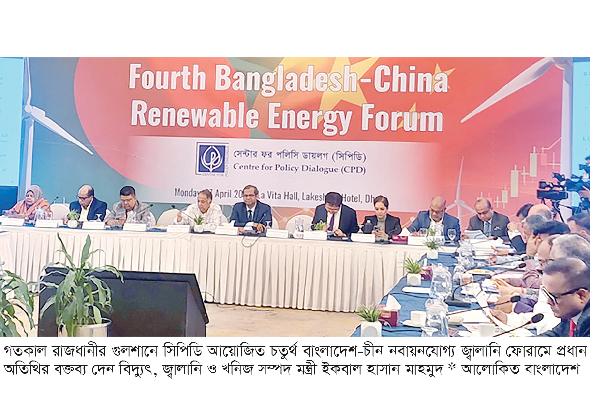গতকাল সোমবার রাজধানীর গুলশানে সেন্টার ফর পলিসি ডায়ালগ (সিপিডি) আয়োজিত চতুর্থ বাংলাদেশ-চীন নবায়নযোগ্য জ্বালানি ফোরামে প্রধান অতিথির বক্তব্যে তিনি এসব কথা বলেন।