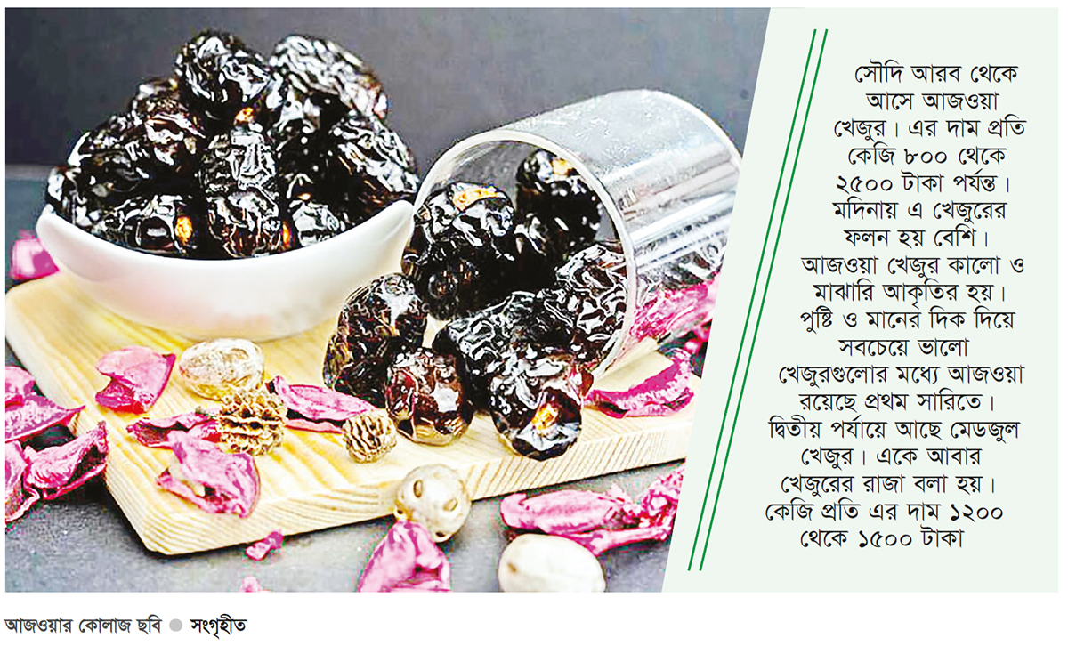 সবচেয়ে দামি খেজুর : বিশ্বের সবচেয়ে দামি খেজুর হলো, আজওয়া। হাদিসে আজওয়া খেজুরের অনেক ফজিলত বর্ণিত হয়েছে। রাসুল (সা.) বলেন, ‘যে ব্যক্তি প্রতিদিন সকালে সাতটি আজওয়া খেজুর খাবে, বিষ ও জাদু তার কোনো ক্ষতি করতে পারবে না।’ (মুসলিম : ২০৪৭)। আজওয়ার মধ্যেও আবার অনেক পদ আছে। সৌদি আরব থেকে আসে আজওয়া খেজুর। এর দাম প্রতি কেজি ৮০০ থেকে ২৫০০ টাকা পর্যন্ত। মদিনায় এ খেজুরের ফলন হয় বেশি। আজওয়া খেজুর কালো ও মাঝারি আকৃতির হয়। পুষ্টি ও মানের দিক দিয়ে সবচেয়ে ভালো খেজুরগুলোর মধ্যে আজওয়া রয়েছে প্রথম সারিতে। দ্বিতীয় পর্যায়ে আছে মেডজুল খেজুর। একে আবার খেজুরের রাজা বলা হয়। কেজি প্রতি এর দাম ১২০০ থেকে ১৫০০ টাকা। বাংলাদেশের বাজারে ১০০টিরও বেশি প্রজাতির খেজুর পাওয়া যায়। যার মধ্যে মাবরুম, মরিয়ম, সুকারি, সুগাই, ভিআইপি, মাশরুক, কালমি, আম্বার ও আজওয়া অন্যতম।