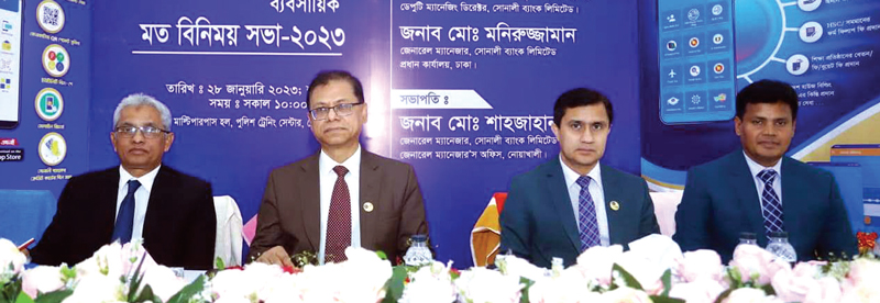 সোনালী ব্যাংক লিমিটেড, জেনারেল ম্যানেজার’স অফিস, নোয়াখালীর আওতাধীন প্রিন্সিপাল অফিস নোয়াখালী, ফেনী ও লক্ষ্মীপুর এবং নোয়াখালী ও ফেনী কর্পোরেট শাখার প্রধান এবং এসব প্রিন্সিপাল অফিসের আওতাধীন শাখা ব্যবস্থাপকগণের অংশগ্রহণে ‘বার্ষিক সম্মেলন ও ব্যবসায়িক মতবিনিময় সভা অনুষ্ঠিত হয়েছে। গতকাল শনিবার নোয়াখালী পুলিশ ট্রেনিং সেন্টারের মাল্টিপারপাস হলে অনুষ্ঠিত মতবিনিময় সভায় জেনারেল ম্যানেজার’স অফিস, নোয়াখালীর জেনারেল ম্যানেজার মো. শাহজাহানের সভাপতিত্বে প্রধান অতিথি হিসেবে উপস্থিত ছিলেন ব্যাংকের সিইও অ্যান্ড ম্যানেজিং ডিরেক্টর মো. আফজাল করিম এবং বিশেষ অতিথি হিসেবে উপস্থিত ছিলেন ডেপুটি ম্যানেজিং ডিরেক্টর নিরঞ্জন চন্দ্র দেবনাথ ও জেনারেল ম্যানেজার মো. মনিরুজ্জামান।