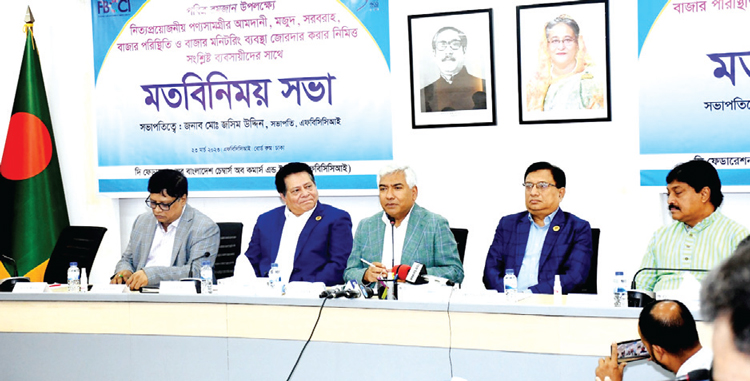 রমজানে তেল, চিনি, ছোলাসহ সব ধরনের নিত্যপণ্যের দাম স্থিতিশীল রাখতে খুচরা ও পাইকারি ব্যবসায়ী, উৎপাদনকারী, আমদানিকারক এবং বাজার কমিটিগুলোকে আহ্বান জানিয়েছে দি ফেডারেশন অব বাংলাদেশ চেম্বার্স অব কমার্স অ্যান্ড ইন্ডাস্ট্রিজ (এফবিসিসিআই)। গতকাল বৃহস্পতিবার রমজান উপলক্ষ্যে নিত্যপ্রয়োজনীয় পণ্যের আমদানি, মজুত, সরবরাহ, বাজার পরিস্থিতি ও বাজার মনিটরিং ব্যবস্থা জোরদার করার লক্ষ্যে সংশ্লিষ্ট ব্যবসায়ীদের সাথে মতবিনিময় সভায় এই আহ্বান জানান এফবিসিসিআই সভাপতি মো. জসিম উদ্দিন। এ সময় তিনি বলেন, ‘বাজার স্থিতিশীল রাখতে ইতিমধ্যে সরকার কিছু পদক্ষেপ নিয়েছে। এক্ষেত্রে ভোক্তা এবং ব্যবসায়ীদেরও দায়িত্বশীল হতে হবে। ভোক্তাদের যেমন প্রয়োজনের অতিরিক্ত কেনাকাটা থেকে বিরত থাকতে হবে, ব্যবসায়ীদেরও অতি মুনাফা করা থেকে বিরত থাকতে হবে।’ কোনো ব্যবসায়ী যেন ভোক্তাদের কাছ থেকে পণ্যের অযৌক্তি দাম আদায় করতে না পারেন, সে বিষয়ে বাজার কমিটিগুলোকে তৎপর থাকার আহ্বান জানান মো. জসিম উদ্দিন। তিনি বলেন, ‘আমরা চাই না ভোক্তা অধিকার সংরক্ষণ অধিদপ্তর অভিযান চালিয়ে ব্যবসায়ীদের হেনস্তা করুক। পণ্য ক্রয়-বিক্রয় ও মজুত বিষয়ে সরকারের নিয়মনীতি রয়েছে। এসব বিষয়ে সাধারণ ব্যবসায়ীদের সচেতন করতে বাজার কমিটিগুলো উদ্যোগ গ্রহণ করতে হবে। কোনো পণ্যের সরবরাহ বিঘ্নিত হলে আমাদের জানান, আমরা সহযোগিতা করব।’ কোনো বাজারে অযৌক্তিক মূল্যে পণ্য ক্রয়-বিক্রয় হলে এবং এ বিষয়ে বাজার কমিটির উদাসীনতা দেখা গেলে সরকার কমিটির লাইসেন্স বাতিল করবে জানিয়ে সবাইকে সতর্ক করেন এফবিসিসিআই সভাপতি।