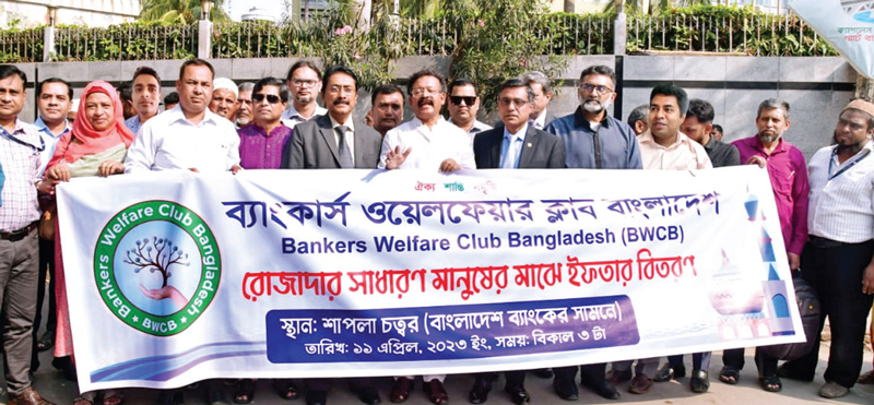 রাজধানীর মতিঝিল শাপলা চত্বরে ‘ব্যাংকার্স ওয়েলফেয়ার ক্লাব বাংলাদেশ’র উদ্যোগে রোজাদার সাধারণ মানুষের মধ্যে ইফতার বিতরণ করা হয়। গত ১১ এপ্রিল বিকালে ইফতার বিতরণ অনুষ্ঠানে প্রধান অতিথি ছিলেন বাংলাদেশ ব্যাংকের সাবেক নির্বাহী পরিচালক, সোনালী ব্যাংক লিমিটেডের ব্যবস্থাপনা পরিষদের পরিচালক ড. আবুল কালাম আজাদ। সংগঠনের সাধারণ সম্পাদক লায়ন হামিদুল আলম সখার পরিচালনায় সভাপতিত্ব করেন সংগঠনের সভাপতি ড. তাপস চন্দ্র পাল। সংক্ষিপ্ত আলোচনা অনুষ্ঠানে বক্তব্য দেন ইফতার বিতরণ অনুষ্ঠান উপকমিটির আহ্বায়ক ও সংগঠনের যুগ্ম সাধারণ সম্পাদক মো. আনোয়ারুল ইসলাম খন্দকার। অনুষ্ঠানে উপস্থিত ছিলেন ব্যাংকার্স ওয়েলফেয়ার ক্লাব বাংলাদেশের সহ-সভাপতি কুদরত এ হায়াত খান, যুগ্ম সাধারণ সম্পাদক সনজিত কুমার বণিক, কোষাধ্যক্ষ আবু জাফর মো. মহিউদ্দিন, সাংগঠনিক সম্পাদক ও ইফতার বিতরণ অনুষ্ঠান উপকমিটির সদস্য সচিব আনিচ মুন্সী, দপ্তর সম্পাদক রফিকুল ইসলাম, ত্রাণ ও পরিবেশবিষয়ক সম্পাদক চৌধুরী বাশার ওয়াদুদ সুমন, সমাজকল্যাণ সম্পাদক মোখলেসুর রহমান, মহিলাবিষয়ক সম্পাদক হাসিনা মমতাজ, ক্রিড়া সম্পাদক ইমরান হক খান, প্রযুক্তিবিষয়ক সম্পাদক সুমন মালাকার, আইনবিষয়ক সম্পাদক মো. নিজাম উদ্দিন, সদস্য অহিদুল ইসলাম, মো. এনায়েত উদ্দিন, মো. মুকিতুল কবীর, মো. আশেকুল ইসলাম, মোহাম্মদ আব্দুল হামিদ সোহাগ, মো. তরিকুল ইসলাম, মো. রাকিবুল ইসলাম ও মো. ইফতেখায়রুল ইসলাম।