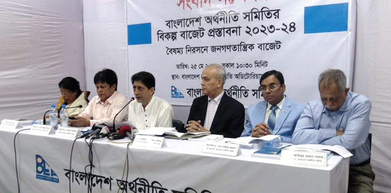 আগামী ২০২৩-২৪ অর্থবছরের জন্য ২০ লাখ ৯৪ হাজার ১১২ কোটি টাকার বিকল্প বাজেট পেশ করেছে বাংলাদেশ অর্থনীতি সমিতি, যা চলতি অর্থবছরের তুলনায় তিনগুণ, জুনে সরকারের পেশ করতে যাওয়া প্রস্তাবিত বাজেটের তুলনায় ২.৭ গুণ বড়। গতাকাল বৃহস্পতিবার অর্থনীতি সমিতির অডিটরিয়ামে ‘বাংলাদেশ অর্থনীতি সমিতির বিকল্প বাজেট প্রস্তাবনা ২০২৩-২৪ : বৈষম্য নিরসনে জনগণতান্ত্রিক বাজেট’ শীর্ষক সংবাদ সম্মেলনে সমিতির সভাপতি অধ্যাপক ড. আবুল বারকাত এই বাজেট প্রস্তাব উপস্থাপন করেন। অনুষ্ঠানটি সঞ্চালনা করেন বাংলাদেশ অর্থনীতি সমিতির সাধারণ সম্পাদক অধ্যাপক ড. মো. আইনুল ইসলাম। আবুল বারকাত বলেন, আমাদের ঘোষিত বাজেট সম্প্রসারণশীল বাজেট। এখানে ২৪টি মূল পয়েন্টের উপস্থাপন করা হয়েছে। যার মধ্যে রয়েছে- বৈষম্য ও অসম দারিদ্র্য নিরসন, সামাজিক সুরক্ষা ও নিরাপত্তা বেষ্টনী, মূল্যস্ফীতি, বিনিয়োগ ও সঞ্চয়, রেমিট্যান্স, পুঁজিবাজার, ব্যাংক, বৈদেশিক খাত, সরকারি ঋণ, কৃষি ভূমি, ভূমি মামলা, স্বাস্থ্য, শিক্ষা, নারীর ক্ষমতায়, প্রতিবন্ধী মানুষ, প্রকৃতি ও সরকারি অর্থের সংস্থান প্রভৃতি। বিকল্প বাজেট সংবাদ সম্মেলনের ভিডিও কনফারেন্সে দেশের ৬৪টি জেলা, ১৩৫টি উপজেলা এবং ৪৫টি ইউনিয়ন থেকে বাংলাদেশ অর্থনীতি সমিতির সদস্য এবং বিভিন্ন শ্রেণিপেশার প্রতিনিধিরা ভার্চুয়ালি যুক্ত রয়েছেন।
