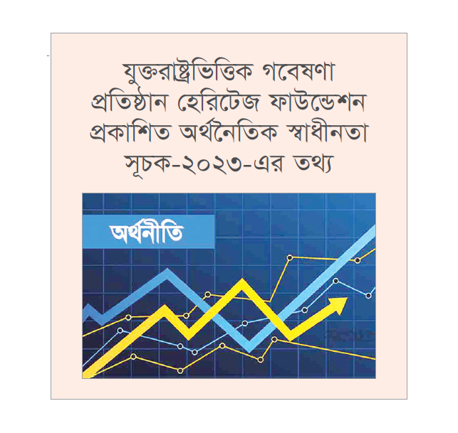 অর্থনৈতিক স্বাধীনতা সূচকে এবার ১৪ ধাপ উন্নতি হয়েছে বাংলাদেশের। ১৭৬টি দেশের মধ্যে ১২৩তম অবস্থানে রয়েছে বাংলাদেশ, যা গত বছর ছিল ১৩৭তম। ২০২১ সালের সূচকে দেশটির অবস্থান ছিল ১২০তম। যুক্তরাষ্ট্রভিত্তিক গবেষণা প্রতিষ্ঠান হেরিটেজ ফাউন্ডেশন প্রকাশিত অর্থনৈতিক স্বাধীনতা সূচক-২০২৩-এ এসব তথ্য উঠে আসে। এতে বলা হয়, বাংলাদেশ ২০২৩ সালের সূচকে ৫৪ দশমিক ৪ পয়েন্ট স্কোর পেয়েছে, যা গত বছরের স্কোর থেকে ১ দশমিক ৭ শতাংশ বেশি। আঞ্চলিক ও বিশ্ব গড়ের চেয়ে কম বাংলাদেশের সামগ্রিক স্কোর। দেশটির অর্থনৈতিক স্বাধীনতার ভিত্তি ভঙ্গুর রয়ে এবং দুর্নীতি ও বিচার বিভাগের অদক্ষতা আইনের শাসনকে ক্ষুণ্ণ করে। কাঠামোগত সমস্যা এবং দুর্বল শাসন উন্নয়নকে বাধাগ্রস্ত করে। অদক্ষ নিয়ন্ত্রক শাসন প্রায়শই ব্যাপকভাবে রাজনীতিকরণ করা হয়। এছাড়া উন্মুক্ত বাজারকে উদারীকরণ বা টিকিয়ে রাখার জন্য প্রয়োজনীয় নীতিগুলো অর্থনীতিতে সরকারি হস্তক্ষেপের কারণে হ্রাস পায় বলেও প্রতিবেদনে বলা হয়েছে। প্রতিবেদন অনুযায়ী, গত বছর ১৭ ধাপ পিছিয়ে যায় বাংলাদেশ। যদিও ৫ বছর ধরে উন্নতির ধারা অব্যাহত ছিল। এই হিসাবে এবারের তালিকায় ঘুরে দাঁড়িয়েছে বাংলাদেশ। ২০২২ সালের সূচকে বাংলাদেশের স্কোর ছিল ৫২ দশমিক ৭ শতাংশ, যা ২০২১ সালে ছিল ৫২ দশমিক ৫। ২০২০ সালে ১৮৪ দেশের মধ্যে ১২০তম অবস্থানে ছিল বাংলাদেশ। ওই বছর দেশটির স্কোর ছিল ৫৬ দশমিক ৫। ২০১৯ সালে ছিল ১২১তম। ২০১৮ এবং ২০১৭ সালে এই অবস্থান ছিল ১২৮তম। প্রত্যেক ব্যক্তির মৌলিক অধিকার হলো নাগরিকের শ্রম ও সম্পদের ওপর পূর্ণ নিয়ন্ত্রণ থাকা। অর্থনৈতিকভাবে একটি সমাজে একজন নাগরিক শ্রম ও ব্যবসায় কতটুকু স্বাধীনতা ভোগ করছেন; কর্ম, উৎপাদন, ভোগ এবং যেভাবে খুশি সেভাবে বিনিয়োগ করার স্বাধীনতা পাচ্ছেন কি না এবং অর্থনৈতিকভাবে স্বাধীন দেশে শ্রম, পুঁজি ও উৎপাদিত পণ্যের অবাধ প্রবাহ নিশ্চিত করতে বাধ্য সরকার। এসব কিছু বিবেচনায় নিয়ে এই সূচক তৈরি করা হয়।