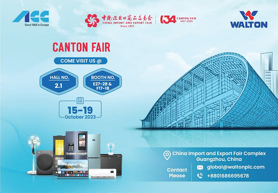 বাংলাদেশি গ্লোবাল ইলেকট্রনিক্স ব্র্যান্ড ওয়ালটন তৃতীয় বারের মত অংশ নিচ্ছে বিশ্বের সর্ববৃহৎ পণ্যমেলা হিসেবে পরিচিত ‘চায়না আমদানি ও রপ্তানি মেলা’; যা ক্যান্টন ফেয়ার নামে সারা বিশ্বে সুপরিচিত। চীনের ঐতিহ্যবাহী এবং মর্যাদাপূর্ণ এই মেলায় এবারও ‘মেড ইন বাংলাদেশ’ খ্যাত ইলেকট্রনিক্স ও ইলেকট্রিক্যাল পণ্যের একমাত্র প্রতিনিধিত্বকারি প্রতিষ্ঠান ওয়ালটন। চীনের গুয়াংজুতে আগামী ১৫ অক্টোবর থেকে শুরু হচ্ছে ১৩৪তম শরৎকালীন চায়না ইমপোর্ট অ্যান্ড এক্সপোর্ট বা ক্যান্টন ফেয়ার। মোট তিনটি ধাপে নভেম্বরের ৪ তারিখ পর্যন্ত চলবে এই মেলা। দেশটির বাণিজ্য মন্ত্রণালয়ের তত্ত্বাবধানে ৬৬ বছর ধরে প্রতিবছর এপ্রিল ও অক্টোবর মাসে অনুষ্ঠিত হয় এই মেগা ইভেন্ট। অক্টোবরের এই শরৎকালীন মেলার প্রথম ধাপ ১৫ তারিখ থেকে শুরু হয়ে চলবে ১৯ তারিখ পর্যন্ত। যেখানে ইলেকট্রনিক্স অ্যান্ড হাউজহোল্ড ইলেকট্রিক্যাল অ্যাপ্লায়েন্সেস, লাইটিং ইক্যুইপমেন্ট, ভেহিক্যালস অ্যান্ড স্পেয়ার পার্টস, মেশিনারি এবং হার্ডওয়্যার অ্যান্ড টুলস পণ্য প্রদর্শিত হবে।