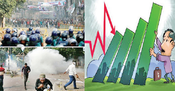 একপ্রকার দুঃসময়ই পার করছে গত তিন বছর ধরে দেশের অর্থনীতি। করোনা-পরবর্তী বৈশ্বিক অর্থনৈতিক সংকট ও রাশিয়া-ইউক্রেন যুদ্ধের মধ্যেই নতুন কিছু চ্যালেঞ্জের মোকাবিলা করতে হচ্ছে অর্থনীতিকে। এই বৈশ্বিক ঘটনাগুলোর কারণে পণ্যমূল্য নাটকীয়ভাবে বেড়ে গেছে, টাকার অবমূল্যায়ন হয়েছে ৩৫ শতাংশ। অর্থনীতি যখন এসব ধাক্কা সামলে ওঠার চেষ্টা করছে, তার মধ্যেই আসন্ন জাতীয় নির্বাচনের আগে চলমান রাজনৈতিক অস্থিরতা বিভিন্ন খাতকে নতুন সংকটের দিকে ঠেলে দিয়েছে। এতে বড় হচ্ছে দেশের অর্থনীতির ক্ষত। উদাহরণস্বরূপ, অর্থনৈতিক গতিমন্থরতার প্রভাবে বন্দরনগরী চট্টগ্রামের ইনল্যান্ড কনটেইনার ডিপোগুলোতে (আইসিডি) ক্রমশ বাড়ছে খালি কনটেইনারের সংখ্যা। রাশিয়া-ইউক্রেন যুদ্ধ এবং পরবর্তীতে সৃষ্ট ডলার সংকটের পর থেকে আমদানি-রপ্তানি বাণিজ্য আগেই চ্যালেঞ্জের মুখে পড়েছিল। এখন চলমান রাজনৈতিক অস্থিরতার কারণে আমদানি-রপ্তানির পরিমাণ ২০ শতাংশ পর্যন্ত কমে যেতে পারে বলে শিল্প নেতারা আশঙ্কা করছেন। গত ২৯ অক্টোবর থেকে বিরোধী দলগুলোর ডাকা চলমান হরতাল-অবরোধে বিশেষভাবে গুরুত্বপূর্ণ আমদানিনির্ভর শিল্পগুলোর ওপর নেতিবাচক প্রভাব পড়ছে। যেমন, ইস্পাত শিল্পে বিশৃঙ্খলা দেখা দিয়েছে, সম্প্রতি কমে গেছে স্ক্র্যাপ জাহাজ আমদানি, অনেক শিপব্রেকিং ইয়ার্ডও বন্ধ হয়ে গেছে। এছাড়া বড় ধাক্কা খেয়েছে সিমেন্ট খাতও- এ শিল্পে নির্মাণ সামগ্রীর উৎপাদন এবং বিক্রি কমেছে অন্তত ৩০-৪০ শতাংশ যার ফলে খাতটির চ্যালেঞ্জ আরও বেড়েছে। গত ২ নভেম্বর রপ্তানি উন্নয়ন ব্যুরো (ইপিবি) প্রকাশিত তথ্য অনুসারে, অক্টোবর মাসে ৩.৭৬ বিলিয়ন ডলারের পণ্য রপ্তানি হয়েছে, যা ২৬ মাসের মধ্যে সর্বনিম্ন। আগের বছরের একই মাসে মোট ৪.৩৫ বিলিয়ন ডলারের পণ্য রপ্তানি হয়েছিল। সে তুলনায় এটি বড় পতনেরই ঘটনা। তৈরি পোশাক, পাট ও পাটজাত পণ্য, চামড়া ও চামড়াজাত পণ্য, হোম টেক্সটাইল এবং কৃষিপণ্য থেকে শুরু করে প্রধান প্রধান সব খাতেই রপ্তানি পারফরম্যান্সের মন্দ দশা দেখা গেছে। এসব খাতে নেতিবাচক প্রবৃদ্ধি হয়েছে। এই পতনের জন্য যুক্তরাষ্ট্র, ইউরোপীয় ইউনিয়নসহ প্রধান রপ্তানি বাজারগুলোতে চাহিদা কমে যাওয়া এবং ভূরাজনৈতিক উত্তেজনাকে দায়ী বলে মনে করছেন রপ্তানিকারকরা। এছাড়া গত ২৩ অক্টোবর থেকে আশুলিয়া ও গাজীপুরের মতো তৈরি পোশাক উৎপাদনের প্রধান কেন্দ্রগুলোতে যে শ্রমিক আন্দোলন চলছে, তা-ও রপ্তানি চালানে নেতিবাচক প্রভাব ফেলেছে। স্টেকহোল্ডাররা বলছেন, চলমান রাজনৈতিক অস্থিরতার কারণে সাম্প্রতিক সময়ে সপ্তাহের বেশিরভাগ দিন পরিবহণ বন্ধ রাখছেন মালিকরা। এতে পণ্য পরিবহণ কমে যাওয়ায় আমদানি-রপ্তানি ও শিল্প কারখানায় নেতিবাচক প্রভাব পড়েছে। বাংলাদেশ ইনল্