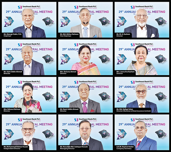 সাউথইস্ট ব্যাংক পিএলসির ২৯তম বার্ষিক সাধারণ সভা অনুষ্ঠিত হয়েছে। গতকাল বুধবার বেলা ১১টায় ভাচ্যুয়ালি এ সভা অনুষ্ঠিত হয়। ব্যাংকের চেয়ারম্যান আলমগীর কবিরের সভাপতিত্বে সভায় অংশ নেন ব্যাংকের ভাইস চেয়ারম্যান মো. আকিকুর রহমান, ব্যাংকের প্রতিষ্ঠাতা চেয়ারম্যান এবং উদ্যোক্তা পরিচালক এম এ কাশেম, ব্যাংকের সাবেক চেয়ারম্যান এবং উদ্যোক্তা পরিচালক আজিম উদ্দিন আহমেদ, উদ্যোক্তা পরিচালক দুলুমা আহমেদ, উদ্যোক্তা পরিচালক জোসনা আরা কাশেম, পর্ষদের পরিচালক- রেহানা রহমান, নাসির উদ্দিন আহমেদ, মো. রফিকুল ইসলাম (প্রতিনিধি পরিচালক, এশিয়া ইন্স্যুরেন্স লি.), স্বতন্ত্র পরিচালক মোহাম্মদ দেলোয়ার হোসেন। সভায় আরো যুক্ত ছিলেন ব্যাংকের ব্যবস্থাপনা পরিচালক নুরুদ্দীন মো. ছাদেক হোসাইন এবং কোম্পানি সচিব একেএম নাজমুল হায়দার। এ ছাড়া ব্যাংকের উদ্যোক্তা ও শেয়ারহোল্ডাররা উপস্থিত ছিলেন। সভায় ২০২৩ অর্থবছরের জন্য ৬ শতাংশ নগদ এবং ৪ শতাংশ বোনাস লভ্যাংশ ঘোষণা করা হয়।