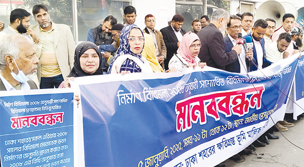 বিগত সরকারের ত্রুটিপূর্ণ ড্যাপ ২০২২-২০৩৫ ও বৈষম্যমূলক ফারের (এফএআর) কারণে ঢাকা শহরের আবাসন উন্নয়ন প্রায় স্থবির হয়ে পড়েছে বলে অভিযোগ করেছেন ক্ষতিগ্রস্ত ঢাকার ভূমি মালিক সমিতি। তারা জানান, ঢাকার দুই লক্ষাদিকের উপরে ভূমি মালিকরা ভয়ংকর ক্ষতির মুখে পড়েছি। এই বৈষম্যমূলক ডাপের কারণে দ্রুত বাড়ছে ফ্ল্যাটের দাম এবং বাড়ি ভাড়া। এই অবস্থা থেকে পরিত্রাণের জন্য ঢাকা মহানগর ইমারত বিধিমালা ২০০৮ অনুসারে ভবন নির্মাণের দাবি জানিয়েছেন ঢাকার ক্ষতিগ্রস্ত ভূমি মালিক সমিতির নেতারা। গতকাল রোববার জাতীয় প্রেসক্লাবের সামনে সকালে আয়োজিত এক মানববন্ধন থেকে এসব অভিযোগ করেন তারা। ক্ষতিগ্রস্ত ঢাকার ভূমি মালিক সমিতির সমন্বয়ক অধ্যাপক ড. দেওয়ান এমএ সাজ্জাদের সভাপতিত্বে আয়োজিত মানববন্ধনে কয়েকশ’ ভূমি মালিক অংশ নেন। মানববন্ধন থেকে ঢাকার ভূমি মালিকরা অভিযোগ করে বলেন, ‘রাজধানীকে বাসযোগ্য নগরী হিসেবে গড়ে তোলার ট্যাগ দিয়ে নিজেদের স্বার্থ সিদ্ধির লক্ষ্যে রাজউকের কতিপয় কর্মকর্তার ছত্রছায়ায় ২০২২ সালের ২৩শে আগস্ট ড্যাপ ২০২২-২০৩৫ প্রনয়ণ করা হয়। ঢাকা শহরের বহুবিধ সমস্যাকে পাশ কাটিয়ে একমাত্র ভবন নির্মাণের বিষয়টিকে প্রাধান্য দিয়ে এটা করা হয়, যা নাগরিকদের মধ্যে বিশাল বৈষম্য সৃষ্টি তৈরি করে। ড্যাপ ২০২২-২০৩৫ এ ঢাকা শহরের মাত্র ২০ শতাংশ পরিকল্পিত এরিয়ায় সু-উচ্চ ভবন নির্মাণের ব্যবস্থা রেখে অবশিষ্ট ৮০ শতাংশ এরিয়াকে অপরিকল্পিত এরিয়ার ট্যাগ দিয়ে ভবনের উচ্চতা ও আয়তন হ্রাস কমিয়ে দেওয়া হয়।’ তারা বলেন, ‘এই শহরের প্রকৃত ভূমি মালিকরা ভবন নির্মাণ করতে পারছেন না। নতুন করে কোন ভবন নির্মাণ করতে গেলে সমস্যা তৈরি হচ্ছে। একই পরিমাণ জমিতে আগে যেখানে ১০ তলা ভবন হতো ফার ইস্যুতে, এখন সেখানে ৫ তলা ভবন পাওয়া যাচ্ছে। এতে ব্যাপক ক্ষতি ও চরম বৈষম্যের সম্মুখীন হচ্ছি। এতে ঢাকা শহরের প্রকৃত ভূমি মালিকদের এই শহরের বাহিরে বের করে দেয়ার সূক্ষ্ম পরিকল্পনা করা হয়েছে। ত্রুটিপূর্ণ ড্যাপ ২০২২-২০৩৫ ও বৈষম্যমূলক ফারের (এফএআর) সংশোধন চান ভূমি মালিকরা। আগামী ১৫ জানুয়ারির মধ্যে এ বিষয়ে কার্যকর ব্যবস্থা গ্রহণ না করলে কঠোর কর্মসূচি দেয়ার কথা বলেন ক্ষতিগ্রস্ত ভূমি মালিকরা।’