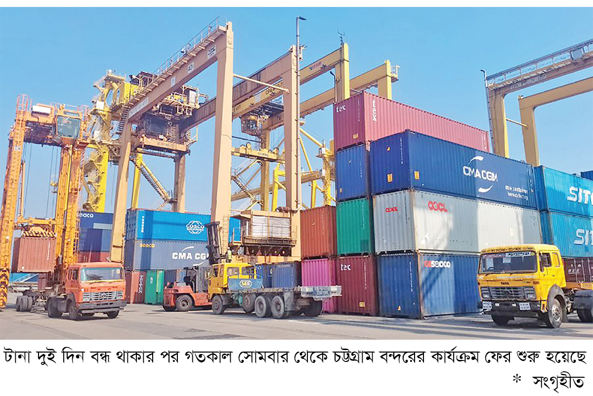 জাতীয় রাজস্ব বোর্ডের (এনবিআর) ‘কমপ্লিট শাটডাউন’ কর্মসূচির কারণে টানা দুই দিন বন্ধ থাকার পর গতকাল সোমবার থেকে চট্টগ্রাম বন্দরের কার্যক্রম ফের শুরু হয়েছে। এনবিআর সংস্কার ঐক্য পরিষদের আন্দোলন প্রত্যাহারের মাধ্যমে এ অচলাবস্থা নিরসন হয়।