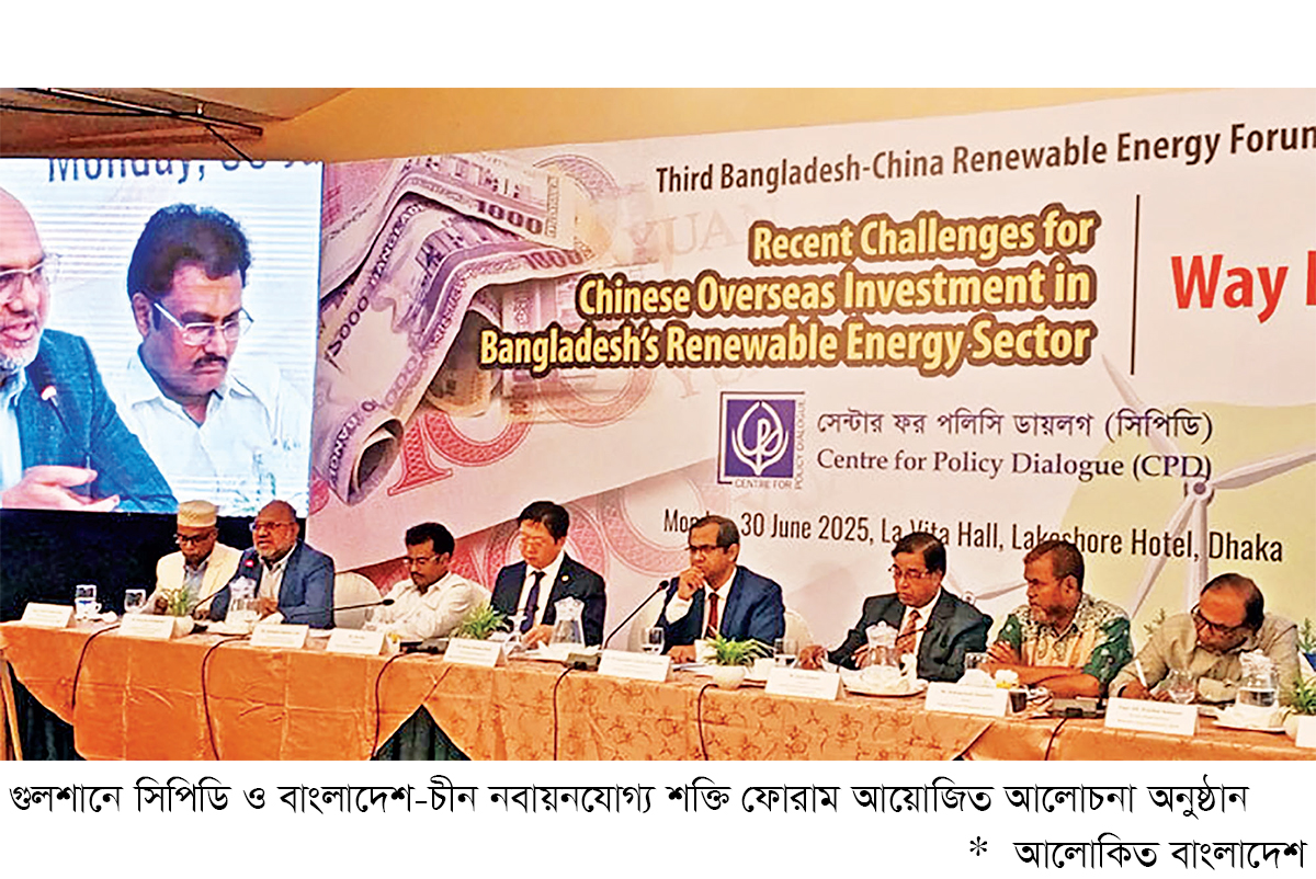 গত সোমবার রাজধানীর গুলশানের একটি হোটেলে ‘বাংলাদেশের নবায়নযোগ্য শক্তি খাতে চীনের বিদেশি বিনিয়োগের সাম্প্রতিক চ্যালেঞ্জ: অগ্রগতির পথ’ শীর্ষক আলোচনা অনুষ্ঠানে এই মন্তব্য করেন আলোচকরা। সিপিডি ও বাংলাদেশ-চীন নবায়নযোগ্য শক্তি ফোরাম এই অনুষ্ঠানের আয়োজন করে।