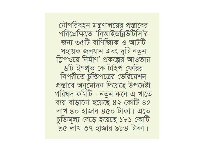 নৌপরিবহন মন্ত্রণালয়ের আর এক প্রস্তাবের পরিপ্রেক্ষিতে ‘বিআইডব্লিউটিসি’র জন্য ৩৫টি বাণিজ্যিক ও আটটি সহায়ক জলযান এবং দুটি নতুন স্লিপওয়ে নির্মাণ’ প্রকল্পের আওতায় ৬টি ইম্প্রুভড ইউটিলিটি টাইপ ফেরির বিপরীতে চুক্তির ভেরিয়েশন প্রস্তাবে অনুমোদন দেওয়া হয়েছে। এ খাতে ব্যয় বাড়ানো হয়েছে ৩৬ কোটি ৫৬ লাখ ৬৬ হাজার ৭৯৮ টাকা। এতে সংশোধিত চুক্তিমূল্য বেড়ে হয়েছে ১৪৩ কোটি ৫১ লাখ ১ হাজার ১৩৯ টাকা।