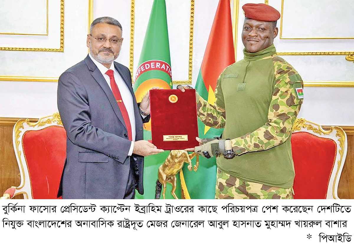 পশ্চিম আফ্রিকার দেশ বুর্কিনা ফাসোর প্রেসিডেন্ট ক্যাপ্টেন ইব্রাহিম ট্রাওরের কাছে পরিচয়পত্র পেশ করেছেন দেশটিতে নিযুক্ত বাংলাদেশের অনাবাসিক রাষ্ট্রদূত মেজর জেনারেল আবুল হাসনাত মুহাম্মদ খায়রুল বাশার। গতকাল বুর্কিনা ফাসোর প্রেসিডেন্টের কাছে পরিচয়পত্র পেশ করেন রাষ্ট্রদূত খায়রুল বাশার।