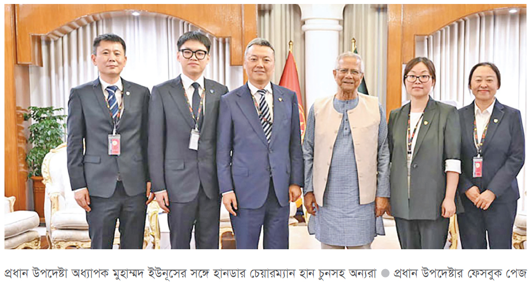 তিনি বলেন, বাংলাদেশের টেক্সটাইল খাতে আপনি চীনা বিনিয়োগের নেতৃত্ব নিন এবং অন্য চীনা বিনিয়োগকারীদেরও এখানে আসার জন্য উৎসাহিত করুন। বাংলাদেশি ডিজাইনারদের প্রশিক্ষণ দেওয়ার আহ্বান জানিয়ে তিনি বলেন, যাতে তারা ক্রেতাদের পছন্দণ্ডরুচি বুঝে কাজ করতে পারেন। হান চুন প্রধান উপদেষ্টার কাছে মিরসরাই অর্থনৈতিক অঞ্চলে স্থাপিতব্য কারখানার একটি নকশা উপস্থাপন করেন। প্রধান উপদেষ্টা নকশাটি দেখে বলেন, এটি আমার কাছে একটি চমৎকার চিত্রকলার মতো লাগছে। প্রথম ধাপে ৮০ মিলিয়ন ডলারের বিনিয়োগে মিরসরাইয়ে গার্মেন্টস কারখানার জমি ইজারার চুক্তি আজ বুধবার স্বাক্ষরিত হয়। দ্বিতীয় ধাপের জমি ও অন্যান্য সুবিধাদি চূড়ান্তকরণের প্রক্রিয়া চলমান, যা ২০২৫ সালের শেষ নাগাদ সম্পন্ন হবে বলে আশা করা হচ্ছে।