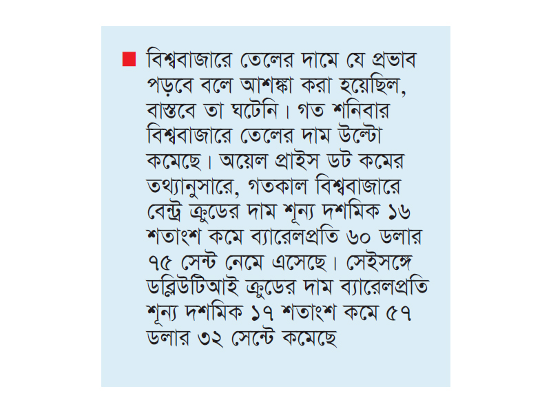 তেলের দাম কমছে : বিশ্বব্যাংকের হিসাবে, ২০২৪ সালের মার্চে অপরিশোধিত জ্বালানি তেল বা ব্রেন্ট ক্রুড অয়েলের ব্যারেলপ্রতি দর ছিল ৮৫ মার্কিন ডলারের কিছু বেশি। গত অক্টোবরে এই দর নেমে আসে ৬৪ ডলারের কাছাকাছি, এখন তা ৬০ ডলার। তেলের দামে বড় উল্লম্ফন ঘটে রাশিয়া-ইউক্রেন যুদ্ধ শুরুর পর। ২০২২ সালে তেলের গড় দাম ব্যারেলে ১০০ ডলার ছাড়িয়ে যায়। ওই বছর সর্বোচ্চ দাম উঠেছিল ১৩৯ ডলার পর্যন্ত। সে কারণে বিশ্বজুড়ে জিনিসপত্রের দামও বাড়তে থাকে। কিন্তু ২০২৩ সাল থেকে বিশ্ববাজারে তেলের দাম কমছে। এরমধ্যে ভূরাজনৈতিক উত্তেজনার কমতি ছিল না। তারপরও তেলের মূল্যবৃদ্ধি না পাওয়ার বড় কারণ হলো বিশ্বের বৃহত্তম তেল আমদানিকারক দেশ চীনের অর্থনীতির গতি কমে যাওয়া। চাহিদা কমে যাওয়ায় এ পরিস্থিতির সৃষ্টি হয়। ফোর্বসের সংবাদে বলা হয়েছে, তৃতীয় বিশ্বযুদ্ধের মতো প্রত্যক্ষ সামরিক সংঘাত শুরু হওয়া ছাড়া হঠাৎ তেলের দাম অনেকটা বেড়ে যেতে পারে কেবল একটি কারণে। সেটা হলো পারস্য উপসাগর থেকে হরমুজ প্রণালি দিয়ে জাহাজ চলাচল বন্ধ হয়ে যাওয়া। প্রতিদিন বিশ্ববাজারে যত তেল সরবরাহ হয়, তার প্রায় ২০ থেকে ২৫ শতাংশ এই গুরুত্বপূর্ণ প্রণালি দিয়ে পরিবাহিত হয়। ফলে টানা কয়েক দিন এই পথে জাহাজ চলাচল বন্ধ থাকলে তেলের দাম দ্রুত আকাশচুম্বী হয়ে উঠবে সম্ভবত ইতিহাসের সর্বোচ্চ পর্যায়েও পৌঁছাতে পারে। তখন চুক্তিভিত্তিক সরবরাহ নিশ্চিত করতে ব্যবসায়ীরা হুড়োহুড়ি করে তেল সংগ্রহে নামবেন। এতে বাজার আরও অস্থির হয়ে উঠবে।