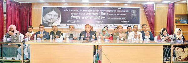 বাংলাদেশের প্রথম নারী প্রধানমন্ত্রী, তিনবারের সফল প্রধানমন্ত্রী ও বাংলাদেশ জাতীয়তাবাদী দল বিএনপির চেয়ারপারসন বেগম খালেদা জিয়ার বিদেহী আত্মার মাগফেরাত কামনায় রাষ্ট্রায়ত্ত রূপালী ব্যাংক পিএলসিতে বিশেষ দোয়া মাহফিলের আয়োজন করা হয়েছে। গতকাল সোমবার দিলকুশাস্থ ব্যাংকের প্রধান কার্যালয়ের কনফারেন্স রুমে এ অনুষ্ঠানের আয়োজন করা হয়। মিলাদ ও দোয়া মাহফিলে মরহুমার রুহের মাগফেরাত এবং শোকসন্তপ্ত পরিবারের প্রতি গভীর সমবেদনা জানিয়ে বিশেষ মোনাজাত করা হয়। এ সময় ব্যাংকের ব্যবস্থাপনা পরিচালক কাজী মো. ওয়াহিদুল ইসলাম দোয়া মাহফিলে অংশ নেন। এতে উপস্থিত ছিলেন উপব্যবস্থাপনা পরিচালক তাহমিনা আখতার, হাসান তানভীর ও মো. হারুনুর রশীদ। রূপালী ব্যাংক কর্মচারী সংঘের উদ্যোগে আয়োজিত দোয়া মাহফিলে আরও উপস্থিত ছিলেন ব্যাংকের মহাব্যবস্থাপক ইয়াছমিন বেগম, মোহাম্মদ শাহেদুর রহমান, মোহাম্মদ শাহজাহান চৌধুরী, মোহাম্মদ সাফায়েত হোসেন, মো. মঈনুদ্দিন মাসুদ, সালামুন নেছা ও শেখ মনজুর করিম ব্যাংকের বিভিন্ন স্তরের কর্মকর্তা-কর্মচারীরা দোয়া মাহফিলে অংশগ্রহণ করেন। এছাড়াও কর্মচারী সংঘের সভাপতি মো. নূরুল হক সরদার (নিরু) ও সাধারণ সম্পাদক হোসেন আহমেদ এ সময় উপস্থিত ছিলেন। সূত্র : সংবাদ বিজ্ঞপ্তি
