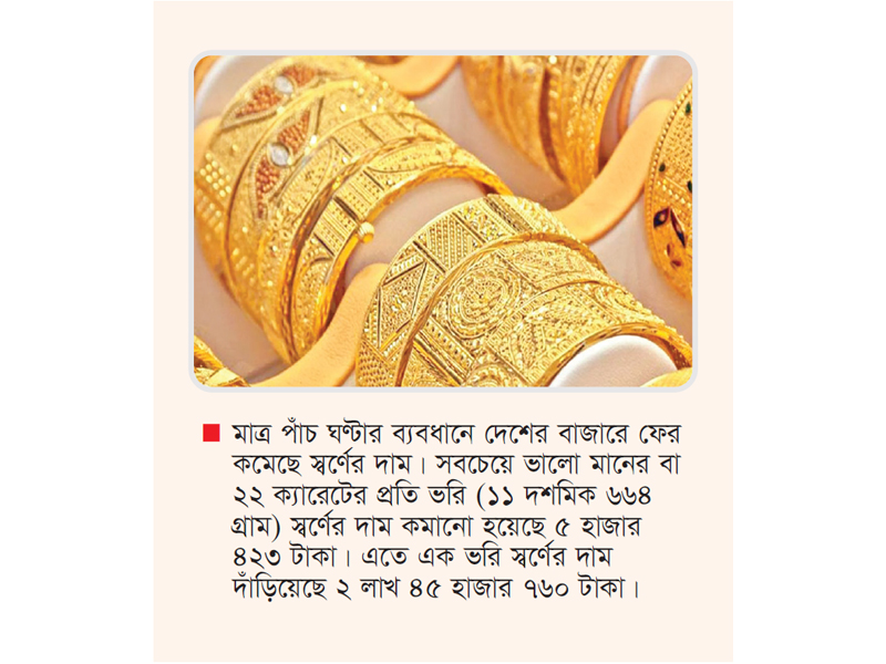 একই দিনে মাত্র পাঁচ ঘণ্টার ব্যবধানে দেশের বাজারে ফের কমেছে স¦র্ণের দাম। সবচেয়ে ভালো মানের বা ২২ ক্যারেটের প্রতি ভরি (১১ দশমিক ৬৬৪ গ্রাম) স¦র্ণের দাম কমানো হয়েছে ৫ হাজার ৪২৩ টাকা। এতে এক ভরি স¦র্ণের দাম দাঁড়িয়েছে ২ লাখ ৪৫ হাজার ৭৬০ টাকা।