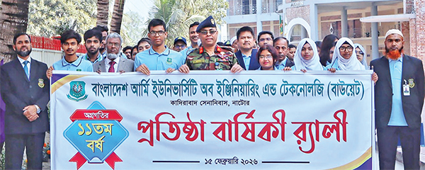 বাংলাদেশ আর্মি ইউনিভার্সিটি অব ইঞ্জিনিয়ারিং অ্যান্ড টেকনোলজি (বাউয়েট)-এর ১১তম প্রতিষ্ঠাবার্ষিকী উদযাপন উপলক্ষে বিভিন্ন কর্মসূচি পালন করা হয়েছে। গতকাল রোববার সকালে পতাকা উত্তোলন, শান্তির প্রতীক কবুতর অবমুক্তকরণ, বিশেষ মোনাজাত, কেক কাটা, বর্ণাঢ্য র‌্যালি এবং প্রীতি ফুটবল ম্যাচের আয়োজন করা হয়। দিবসের শুরুতে জাতীয় পতাকা এবং বিশ্ববিদ্যালয়ের পতাকা উত্তোলন ও সালাম প্রদান করেন যথাক্রমে উপাচার্য ব্রিগেডিয়ার জেনারেল এসএম লুৎফর রহমান এবং ট্রেজারার কর্নেল মো. শওকত হুসেন, পিএসসি (অব.)। শিক্ষকমন্ডলী, কর্মকর্তা, কর্মচারী ও ছাত্র-ছাত্রীদের ক্লাস প্রতিনিধিদের অংশগ্রহণে এক বর্ণাঢ্য র‌্যালি বাউয়েট প্লাজা থেকে শুরু হয়ে ক্যাম্পাসের গুরুত্বপূর্ণ সড়ক প্রদক্ষিণ করে আবার প্লাজাতে এসে শেষ হয়। এছাড়া বিশ্ববিদ্যালয় দিবস উদযাপন উপলক্ষে বাউয়েট গেমস, স্পোটর্স অ্যান্ড জিমনেশিয়াম ক্লাবের উদ্যোগে কেন্দ্রীয় খেলার মাঠে শিক্ষক-কর্মকর্তা ও শিক্ষার্থীদের মধ্যে এক প্রীতি ফুটবল ম্যাচের আয়োজন করা হয়। এসময় উপস্থিত ছিলেন বিশ্ববিদ্যালয়ের পরীক্ষা নিয়ন্ত্রক কর্নেল হ্লা হেন মং (অব.), সায়েন্স অ্যান্ড হিউম্যানিটিস এবং আইন অনুষদের ডিন প্রফেসর ড. মো. সাজ্জাদ হোসেন, মেকানিক্যাল ইঞ্জিনিয়ারিং অনুষদের ডিন প্রফেসর ড. মোহাম্মদ নূরুল ইসলাম, ইসিই অনুষদের ডিন প্রফেসর মোহাম্মদ গোলাম সরওয়ার ভূঁঞা, ভারপ্রাপ্ত রেজিস্ট্রার মেজর মো. মনজিনুল মুবীন (অব.), বিভাগীয় প্রধানরা, প্রক্টর, ছাত্র কল্যাণ উপদেষ্টা, ডেপুটি রেজিস্ট্রার, শিক্ষকমন্ডলি, কর্মকর্তা, কর্মচারী ও শিক্ষার্থীরা। সূত্র : সংবাদ বিজ্ঞপ্তি