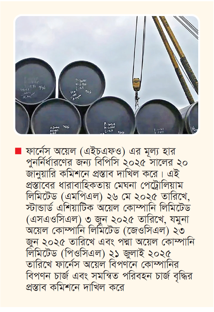 গতকাল রোববার দুপুরে বাংলাদেশ এনার্জি রেগুলেটরি কমিশনের (বিইআরসি) সচিব মো. নজরুল ইসলাম সরকার স্বাক্ষরিত এক বিজ্ঞপ্তিতে নতুন এই দাম ঘোষণা করা হয়েছে। ফার্নেস অয়েল (এইচএফও) এর মূল্য হার পুনর্নির্ধারণের জন্য বিপিসি ২০২৫ সালের ২০ জানুয়ারি কমিশনে প্রস্তাব দাখিল করে। এই প্রস্তাবের ধারাবাহিকতায় মেঘনা পেট্রোলিয়াম লিমিটেড (এমপিএল) ২৬ মে ২০২৫ তারিখে, স্টান্ডার্ড এশিয়াটিক অয়েল কোম্পানি লিমিটেড (এসএওসিএল) ৩ জুন ২০২৫ তারিখে, যমুনা অয়েল কোম্পানি লিমিটেড (জেওসিএল) ২৩ জুন ২০২৫ তারিখে এবং পদ্মা অয়েল কোম্পানি লিমিটেড (পিওসিএল) ২১ জুলাই ২০২৫ তারিখে ফার্নেস অয়েল বিপণনে কোম্পানির বিপণন চার্জ এবং সমন্বিত পরিবহন চার্জ বৃদ্ধির প্রস্তাব কমিশনে দাখিল করে। এই প্রস্তাবসমূহের ওপর চলতি বছরের ২৯ জানুয়ারি কমিশন প্রস্তাবকারী লাইসেন্সিগণ এবং আগ্রহী পক্ষগণের গণশুনানি গ্রহণ করে। প্রস্তাবকারী এবং আগ্রহী পক্ষগণকে ৩ ফেব্রুয়ারি পর্যন্ত গণশুনানি পরবর্তী লিখিত মতামত প্রদানের সুযোগ দেওয়া হয়।
