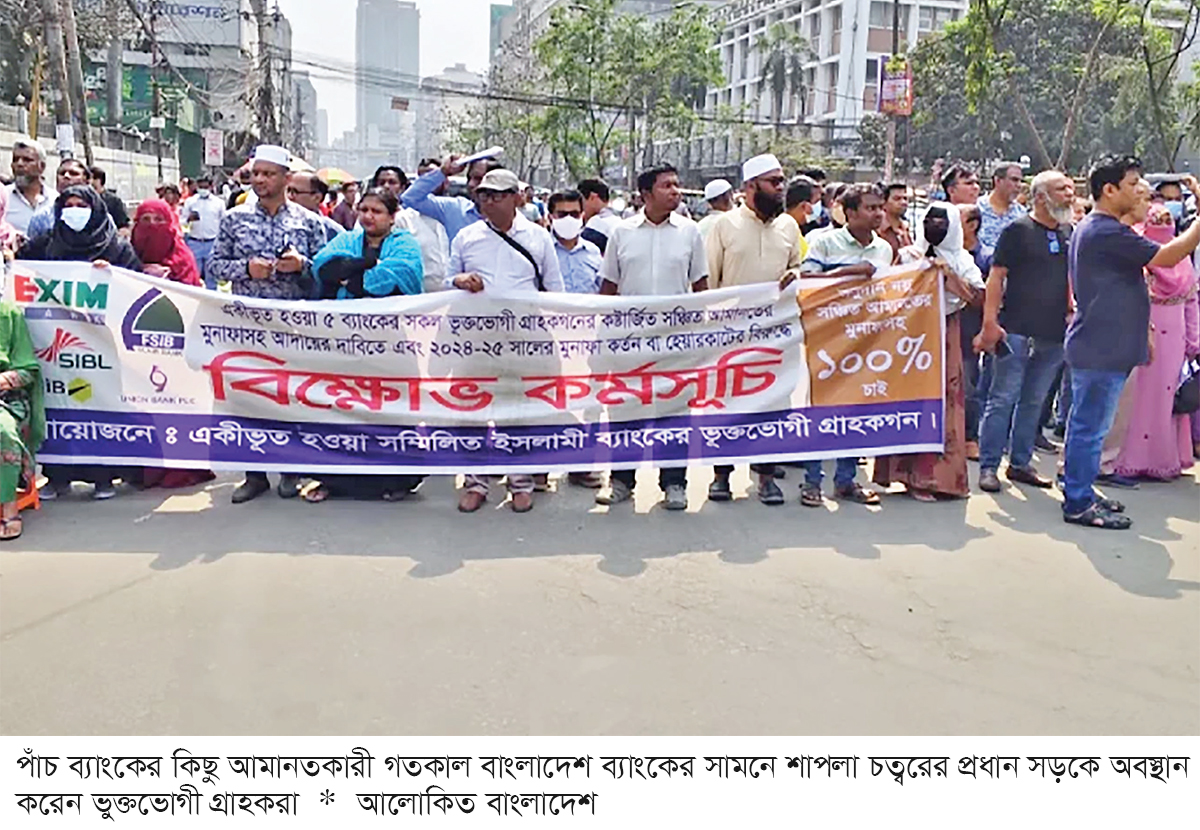 সম্মিলিত ইসলামী ব্যাংকের আমানতকারীরা ‘হেয়ার কাট’ সিদ্ধান্ত বাতিলসহ তিন দফা দাবিতে বাংলাদেশ ব্যাংকের সামনে মানববন্ধন ও অবস্থান কর্মসূচি পালন করছেন। বিক্ষোভকারীরা দ্রুত দাবি মেনে নেওয়ার আহ্বান জানিয়ে আল্টিমেটাম দেন এবং তা বাস্তবায়ন না হলে আগামী ১২ মার্চ বাংলাদেশ ব্যাংক ঘেরাওয়ের কর্মসূচি ঘোষণা করেন। গতকাল বৃহস্পতিবার মানববন্ধনে অংশ নেওয়া আমানতকারীরা অভিযোগ করেন, বাংলাদেশ ব্যাংকের সাবেক গভর্নরের সিদ্ধান্তে শরিয়াহভিত্তিক পাঁচটি ব্যাংকের আমানতের ওপর গত দুই বছরের মুনাফা কেটে মাত্র ৪ শতাংশ দেওয়ার সিদ্ধান্ত নেওয়া হয়েছে। তাদের ভাষ্য, এ সিদ্ধান্ত আমানতকারীদের জন্য অমানবিক ও অন্যায্য।