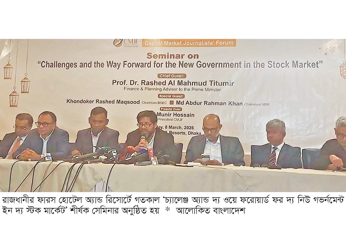 গতকাল রোববার রাজধানীর ফারস হোটেল অ্যান্ড রিসোর্টে আয়োজিত ‘চ্যালেঞ্জ অ্যান্ড দ্য ওয়ে ফরোয়ার্ড ফর দ্য নিউ গভর্নমেন্ট ইন দ্য স্টক মার্কেট’- শীর্ষক সেমিনারে বিশেষ অতিথির বক্তব্যে তিনি এ কথা বলেন। সেমিনারের আয়োজন করে পুঁজিবাজার নিয়ে কাজ করা সাংবাদিকদের সংগঠন ক্যাপিটাল মার্কেট জার্নালিস্ট ফোরাম (সিএমজেএফ)। অনুষ্ঠানে প্রধান অতিথি হিসেবে উপস্থিত ছিলেন প্রধানমন্ত্রীর অর্থ ও পরিকল্পনা উপদেষ্টা প্রফেসর ড. রাশেদ আল মাহমুদ তিতুমীর। এতে বিশেষ অতিথি হিসেবে আরও উপস্থিত ছিলেন জাতীয় রাজস্ব বোর্ডের (এনবিআর) চেয়ারম্যান মো. আবদুর রহমান খান।