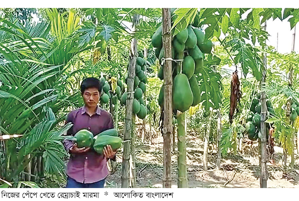 জেলায় পেঁপে চাষ করে কৃষিতে সফল হয়েছেন মাত্র ২২ বছরের যুবক রেম্রাচাই মারমা। তার অনুপ্রেরণায় বদলে গেছে খাগড়াছড়ির মানিকছর দূরছড়ি গ্রাম। রেম্রাচাই মারমাকে অনুসরণ করে ঐ গ্রামের সবাই এখন পেঁপে চাষি। সেই সঙ্গে দারিদ্রতা বিতাড়িত করে এখন স্বাবলম্বী ঐ গ্রামের প্রায় ৫০টি পরিবার। জেলার মানিকছড়ি উপজেলা সদর থেকে প্রায় ১০ কিলোমিটার উত্তর-পূর্বে দুর্গম দূরছড়ি গ্রাম। এ গ্রামে প্রায় ৬০টি পরিবারের বসবাস। আজ থেকে ৫ বছর আগে এ গ্রামের বাসিন্দাদের জীবন ছিল অভাব-অনটনে। কিন্তু রেম্রাচাই মারমার কারণে পুরো গ্রামবাসী এখন অর্থনৈতিকভাবে স্বাবলম্বী। রেম্রাচাই মারমা ২০২১ সালে স্কুলে পড়া অবস্থায় কৃষির প্রতি ঝোঁক ছিল। সে সময় তার ২০০ পেঁপে গাছের বাগান ছিল। রেম্রাচাই মারমা জানান, ২০২৩ সালে মাধ্যমিক পরীক্ষায় অকৃতকার্য হওয়ার পর শিক্ষা জীবন বাদ দিয়ে পুরোদমে কৃষিতে নেমে পড়েন। পর্যাক্রমে বর্তমানে তার ১০ একর জমিতে ৩ হাজার পেঁপের গাছ রয়েছে। এ বছর তিনি ২০ লাখ টাকার পেঁপে বিক্রি করেছেন। গাছে আরও প্রায় ৫ লাখ টাকা পেঁপে ঝুলছে। সামনে আরও ৩ হাজার পেঁপে গাছের চারা রোপণের পরিকল্পনা রয়েছে তার।