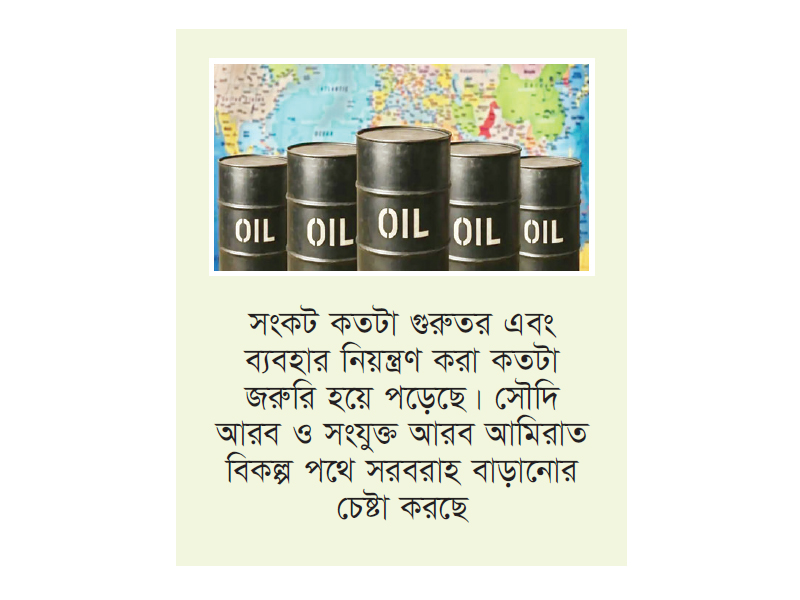 জ্বালানি রেশনিং শুরু, বিকল্প পথে সরবরাহের চেষ্টা : পরিস্থিতি সামাল দিতে অনেক দেশ এরমধ্যে জ্বালানি সাশ্রয়ী ব্যবস্থা ও রেশনিং চালু করেছে। এতে বোঝা যাচ্ছে, সংকট কতটা গুরুতর এবং ব্যবহার নিয়ন্ত্রণ করা কতটা জরুরি হয়ে পড়েছে। সৌদি আরব ও সংযুক্ত আরব আমিরাত বিকল্প পথে সরবরাহ বাড়ানোর চেষ্টা করছে। তবে হরমুজ প্রণালীর মাধ্যমে যে পরিমাণ জ্বালানি পরিবহন হতো, তা পুরোপুরি পূরণ করা তাদের পক্ষে কঠিন।