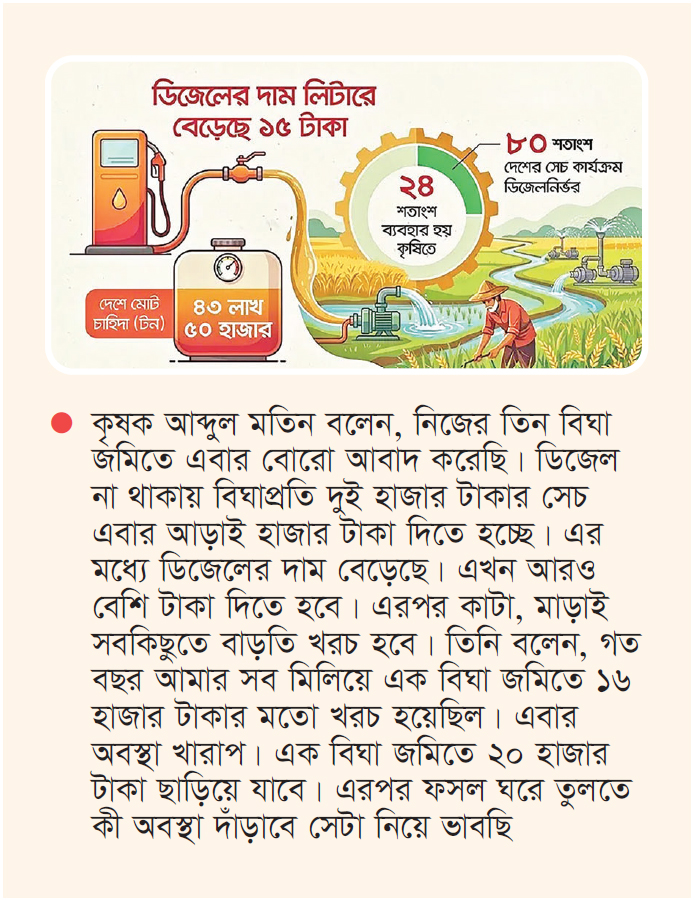 দেশে এখন ডিজেলের চাহিদা প্রায় ৪৩ লাখ ৫০ হাজার টন। এর প্রায় ২৪ শতাংশ, অর্থাৎ ১০ লাখ ৪৪ হাজার টন ব্যবহার হয় কৃষিকাজে। দেশের ৮০ শতাংশ সেচ কার্যক্রমও ডিজেলনির্ভর। পাশাপাশি খেত প্রস্তুত থেকে ফসল ঘরে তোলা পর্যন্তও ডিজেল লাগে। সরকার লিটারে ১৫ টাকা বাড়ানোয় কৃষকের খরচ বাড়বে প্রায় দেড় হাজার কোটি টাকা।