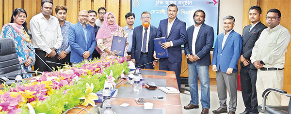 সোনালী ব্যাংক পিএলসির নিজস্ব মোবাইল অ্যাপ সোনালী ই-ওয়ালেট ব্যবহার করে সোনালী ব্যাংকের অ্যাকাউন্ট হতে যে কোনো বিকাশ অ্যাকাউন্টে অ্যাড মানি এবং বিকাশ অ্যাকাউন্ট হতে সোনালী ব্যাংকের যে কোনো অ্যাকাউন্টে ফান্ড ট্রান্সফার সার্ভিস চালুর লক্ষ্যে সোনালী ব্যাংক পিএলসি ও বিকাশ লিমিটেডের মধ্যে এক চুক্তি স্বাক্ষর হয়েছে। এই চুক্তির ফলে এখন হতে সোনালী ই-ওয়ালেট মোবাইল অ্যাপ ব্যবহারকারী খুব সহজেই বিকাশে টাকা পাঠানো ও বিকাশ হতে টাকা সোনালী ব্যাংকের অ্যাকাউন্টে স্থানান্তর করতে পারবেন। গতকাল সোমবার সোনালী ব্যাংকের প্রধান কার্যালয়ের সম্মেলন কক্ষে আয়োজিত চুক্তি স্বাক্ষর অনুষ্ঠানে প্রধান অতিথি ছিলেন ব্যাংকের ডেপুটি ম্যানেজিং ডিরেক্টর মো. রফিকুল ইসলাম। অনুষ্ঠানে সোনালী ব্যাংকের পক্ষে জেনারেল ম্যানেজার আকলিমা ইসলাম এবং বিকাশ লিমিটেডের পক্ষে চিফ কমার্শিয়াল অফিসার আলী আহাম্মেদ চুক্তিতে স্বাক্ষর ও চুক্তিপত্র হস্তান্তর করেন। অনুষ্ঠানে অন্যান্যের মধ্যে ব্যাংকের ডেপুটি জেনারেল ম্যানেজার মোহাম্মদ আসলাম হোসেন, বিকাশ লিমিটেডের ইভিপি অ্যান্ড হেড অব ফিন্যান্স সার্ভিসেস জায়েদ আমিনসহ উভয় প্রতিষ্ঠানের সংশ্লিষ্ট কর্মকর্তারা উপস্থিত ছিলেন। সূত্র : সংবাদ বিজ্ঞপ্তি