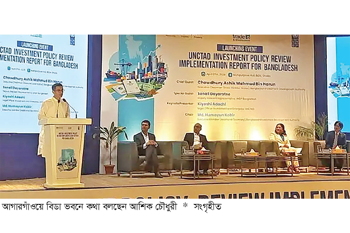দেশে বিনিয়োগ বাড়াতে ‘গিয়ার শিফট’ করা প্রয়োজন বলে মন্তব্য করেছেন বাংলাদেশ বিনিয়োগ উন্নয়ন কর্তৃপক্ষের (বিডা) নির্বাহী চেয়ারম্যান চৌধুরী আশিক মাহমুদ বিন হারুন (আশিক চৌধুরী)। তিনি বলেছেন, আমরা অনেক প্ল্যান করি, অনেক কথা বলি, অনেক সুন্দর সুন্দর রিপোর্ট বের হয় এবং সেই রিপোর্টের সঙ্গে আমরা একমত পোষণ করি। একমত পোষণ করার পর গিয়ে দেখা যায় যে, আমরা আসলে ওই রিপোর্টে যেই কথাগুলো বলা হয়েছে ওগুলো বাস্তবায়ন করি না। গতকাল সোমবার সকালে রাজধানীর আগারগাঁওয়ে বাংলাদেশ বিনিয়োগ উন্নয়ন কর্তৃপক্ষ (বিডা) ভবনে আঙ্কটাড ইনভেস্টমেন্ট পলিসি রিভিউ ইমপ্লেমেনশন রিপোর্ট ফর বাংলাদেশ শীর্ষক রিপোর্ট প্রকাশ অনুষ্ঠানে তিনি এ কথা বলেন।