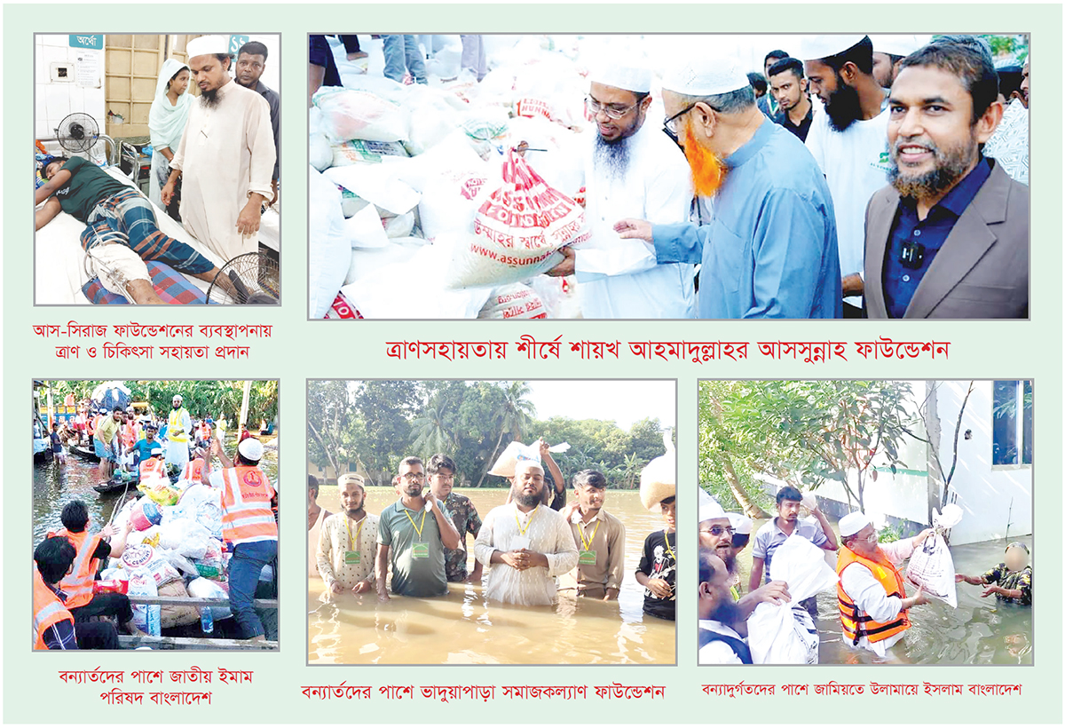 দুর্গত মানুষের কাছে ত্রাণ পৌঁছে দিতে রোববার (২৫ আগস্ট) কুমিল্লায় উপস্থিত হয়ে সরজমিনে ত্রাণ তৎপরতা পরিচালনা করেন। এ সময় তিনি কুমিল্লার বুড়িচং, মনোহরগঞ্জ, মুরাদনগর এবং নোয়াখালীর চৌমুহনীতে স্বেচ্ছাসেবকসহ ত্রাণসামগ্রী পাঠান। এ ছাড়াও ছদর ছাহেব হুজুর (রহ.) ফাউন্ডেশন, গোপালগঞ্জের গওহরডাঙ্গা মাদ্রাসা, বাংলাদেশ জামায়াতে ইসলাম, ছাত্র জমিয়ত বাংলাদেশ, হাফিজ্জি চ্যারিটেবল সোসাইটি অব বাংলাদেশ, হাফেজ্জী হুজুর (রহ.) সেবা ফাউন্ডেশন, ইসলামী ছাত্র আন্দোলন বাংলাদেশ, ফী সাবীলিল্লাহ ফাউন্ডেশন, পিপলস ইমপ্রুভমেন্ট সোসাইটি অফ বাংলাদেশ (পিসব), ইসলামী ছাত্র মজলিস, মারকাযুল ফুরকান শিক্ষা পরিবার, জাতীয় ওলামা মাশায়েখ আইম্মা পরিষদ, শাইখুল হাদীস পরিষদ, রাহমাতুল্লিল আলামিন ফাউন্ডেশন, আল খলীল এডু্েকশন অ্যান্ড কালচারাল সেন্টার, বরুণা মাদ্রাসা, লক্ষ্মীপুর আলোর দিশারী ফাউন্ডেশন, আল-কাসেম ফাউন্ডেশন ও সাদাকাহ ফাউন্ডেশনসহ আলেমদের পরিচালিত আরো অনেক সেবা সংস্থা, রাজনৈতিক সংগঠন ও একক উদ্যোগেও বানভাসি মানুষের পাশে দাঁড়াচ্ছে আলেম সমাজ।