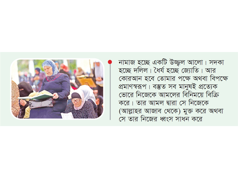 তিলাওয়াতকারীর পক্ষে সাক্ষ্য দান করবে : যে ব্যক্তি কোরআনের হক আদায় করবে, কোরআন বিপদের দিন তার পক্ষে সাক্ষ্য প্রদান করবে। আবু মালিক আশআরি (রা.) বলেন, রাসুলুল্লাহ (সা.) বলেছেন, ‘পবিত্রতা হলো ঈমানের অর্ধেক অংশ। আল-হামদুলিল্লাহ মিজানের পরিমাপকে পরিপূর্ণ করে দেবে এবং সুবহানাল্লাহ ওয়াল-হামদুলিল্লাহ আসমান ও জমিনের মধ্যবর্তী স্থানকে পরিপূর্ণ করে দেবে। নামাজ হচ্ছে একটি উজ্জ্বল আলো। সদকা হচ্ছে দলিল। ধৈর্য হচ্ছে জ্যোতি। আর কোরআন হবে তোমার পক্ষে অথবা বিপক্ষে প্রমাণস্বরূপ। বস্তুত সব মানুষই প্রত্যেক ভোরে নিজেকে আমলের বিনিময়ে বিক্রি করে। তার আমল দ্বারা সে নিজেকে (আল্লাহর আজাব থেকে) মুক্ত করে অথবা সে তার নিজের ধ্বংস সাধন করে।’ (মুসলিম : ৪২২)।