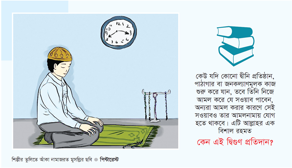 ভালো কাজের সূচনা করা : সওয়াব শুধু দ্বিগুণ নয়, বরং তা হাজার গুণ বা কিয়ামত পর্যন্ত জারি থাকার একটি চমৎকার উপায় হলো কোনো ভালো কাজের সূচনা করা। রাসুলুল্লাহ (সা.) বলেছেন, ‘যে ব্যক্তি ইসলামে কোনো ভালো প্রথা বা রীতির প্রচলন ঘটাবে, সে তার সওয়াব পাবে এবং তার পরে যারা সেই অনুযায়ী আমল করবে, তাদের সওয়াবও সে পাবে; অথচ তাদের সওয়াব থেকে কোনো কিছুই কমানো হবে না।’ (মুসলিম : ১০১৭)। অর্থাৎ কেউ যদি কোনো দ্বীনি প্রতিষ্ঠান, পাঠাগার বা জনকল্যাণমূলক কাজ শুরু করে যান, তবে তিনি নিজে আমল করে যে সওয়াব পাবেন, অন্যরা আমল করার কারণে সেই সওয়াবও তার আমলনামায় যোগ হতে থাকবে। এটি আল্লাহর এক বিশাল রহমত।