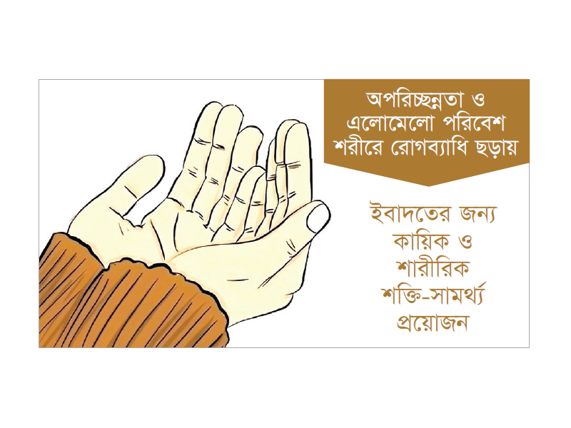 অপরিচ্ছন্নতা ও এলোমেলো পরিবেশ শরীরে রোগব্যাধি ছড়ায়। আর ধীরে ধীরে এর প্রভাব মন ও মস্তিষ্ককে আচ্ছন্ন করে ফেলে। তাই মহানবী (সা.) এ বিষয়ে বিশেষ সতর্ক করেছেন। আবু হুরায়রা (রা.) থেকে বর্ণিত, রাসুল (সা.) বলেছেন, ‘পাঁচটি বিষয় মানুষের স্বভাবজাত ১. খতনা করা। ২. নাভির নিচের অবাঞ্ছিত লোম পরিষ্কার করা। ৩. গোঁফ কাটা। ৪. নখ কাটা এবং ৫. বগলের লোম উপড়ে ফেলা।’ (বোখারি : ৫৮৮৯)। শরীরের সুস্থতা ও সক্ষমতা ধরে রাখা এবং এর উন্নতি সাধন আল্লাহর ইবাদত পালনের স্বার্থেই জরুরি। এ ব্যাপারে অবহেলা কাম্য নয়।