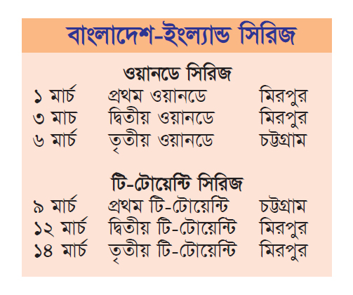 বাংলাদেশ জাতীয় ক্রিকেট দল নতুন বছর শুরু করবে ইংল্যান্ডের বিপক্ষে সিরিজ দিয়ে। ৬ বছর পর বাংলাদেশ সফরে আসছে ইংল্যান্ড ক্রিকেট দল। তিন ম্যাচের ওয়ানডে ও তিনটি টি-টোয়েন্টি সিরিজ খেলবে ইংলিশরা। ১ মার্চ মিরপুরে শুরু হবে ওয়ানডে সিরিজ। দ্বিতীয় ওয়ানডে একই ভেন্যুতে ৩ মার্চ মাঠে গড়াবে। এরপর চট্টগ্রামে যাবে দুই দল। সেখানে ৬ মার্চ খেলবে সিরিজের শেষ ওয়ানডে। তিন ম্যাচের টি-টোয়েন্টি সিরিজও হবে চট্টগ্রামে। ৯, ১২ ও ১৪ মার্চ হবে ম্যাচ তিনটি।