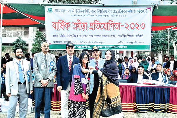 বাংলাদেশ আর্মি ইউনিভার্সিটি অব ইঞ্জিনিয়ারিং অ্যান্ড টেকনোলজি (বাউয়েট) ক্যাম্পাসের কেন্দ্রীয় খেলার মাঠে গতকা বাউয়েট বার্ষিক ক্রীড়া প্রতিযোগিতায় চারটি স্বর্ণ পদক, তিনটি রুপা ও একটি ব্রোঞ্জ জিতে চ্যাম্পিয়ন হয়েছে ব্যবসায় প্রশাসন বিভাগ। বিজয়ীদের পুরস্কৃত করেন বিশ্ববিদ্যালয়ের উপাচার্য ব্রিগেডিয়ার জেনারেল মো. মোস্তফা কামাল (অব.)। উদ্বোধন করেন বিশ্ববিদ্যালয়ের ট্রেজারার কর্নেল মোহাম্মাদ হামিদুল হক, রেজিস্ট্রার লে. কর্নেল শেখ শামীম হোসেন (অব.) এবং বাউয়েট গেইমস, স্পোর্টস অ্যান্ড জিমনেসিয়াম ক্লাবের সভাপতি ও পদার্থবিদ্যা বিভাগের অধ্যাপক ড. মো. সাজ্জাদ হোসেন, ধারাভাষ্যে ছিলেন বাংলার প্রভাষক আরিফা সুলতানা এবং ব্যবসায় প্রশাসন বিভাগের প্রভাষক শেখ মো. তৌফিকুল ইসলাম। আটটি বিভাগের শিক্ষার্থীরা ২৮টি ইভেন্টে অংশ নেয়।