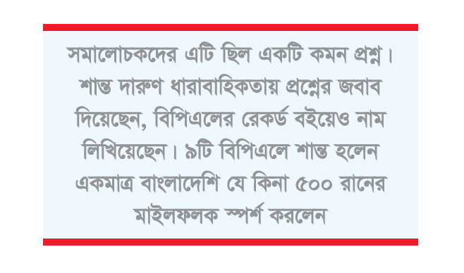 জাতীয় দলে নাজমুল শান্তকে কেন এত সুযোগ দেয়া হয়- সমালোচকদের এটি ছিল একটি কমন প্রশ্ন। শান্ত দারুণ ধারাবাহিকতায় প্রশ্নের জবাব তো দিয়েছেন, বিপিএলের রেকর্ড বইয়েও নাম লিখিয়েছেন। ৯টি বিপিএলে শান্ত হলেন একমাত্র বাংলাদেশি যে কিনা ৫০০ রানের মাইলফলক স্পর্শ করলেন। একমাত্র দক্ষিণ আফ্রিকার রাইলি রুশো রংপুর রাইডার্সের হয়ে ২০১৯ সালে ৫০০ রান করেছিলেন। এ কীর্তি তৌহিদ হৃদয়ও করতে পারতেন। এমনকি শান্তকে ছাড়িয়ে রান সংগ্রহে সেরাও হতে পারতেন। কিন্তু তাঁর দুর্ভাগ্য, দুর্দান্ত ব্যাটিংয়ে টানা তিন খেলায় ম্যাচসেরা হওয়ার পর ফিল্ডিং করতে গিয়ে আঙুল ফেটে যায় তাঁর। এ জন্য প্রায় দুই সপ্তাহ মাঠের বাইরে ছিলেন। এর পরও ১২ ইনিংসে ৪০৩ করে রান সংগ্রাহকদের তালিকায় তৃতীয় হয়েছেন। যার পুরস্কার হিসেবে ইংল্যান্ডের বিপক্ষে প্রথম দুই ওয়ানডের দলে ডাক পেয়েছেন তিনি।