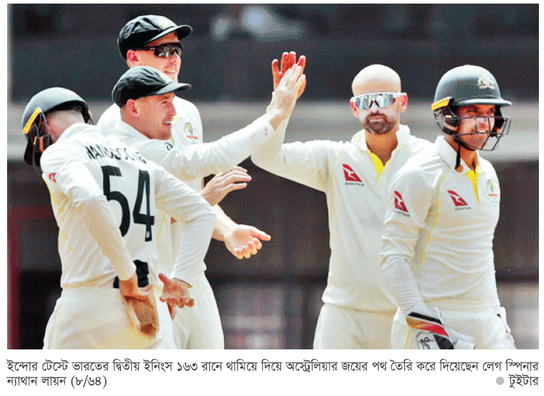 প্রথম দুই টেস্টে তিন দিনেই হারা অস্ট্রেলিয়া এবার জয়ের সুবাস পাচ্ছে লায়নের সৌজন্যেই। টেস্ট ক্যারিয়ারে দ্বিতীয়বার ৮ উইকেট নেন তিনি, ৬৪ রান দিয়ে। তার সেরা পারফরম্যান্স ৫০ রানে ৮ উইকেট, সেটাও ভারতের বিপক্ষে ২০১৭ সালে। প্রথম ইনিংসে ৩ উইকেটের সুবাদে ম্যাচে মোট ১১ শিকার হলো লায়নের। টেস্টে এনিয়ে চতুর্থবার ম্যাচে ১০ বা তার বেশি উইকেট নিলেন তিনি। লায়নের স্পিনে যেভাবে ধস নেমেছিল ভারতের ব্যাটিংয়ে, তাতে আরও আগেই গুটিয়ে যাওয়ার শঙ্কা ছিল তাদের। কিন্তু চোয়ালবদ্ধ দৃঢ়তায় এক প্রান্ত আগলে রাখেন চেতেশ্বর পুজারা (৫৯)। পুরো ম্যাচে ভারতের আর কেউ করতে পারেননি ৩০ রানও। গতকাল দিনের শুরুটা অবশ্য ছিল ভারতের। ৪ উইকেটে ১৫৬ রান নিয়ে খেলতে নামা অস্ট্রেলিয়াকে দুইশর আগে গুটিয়ে দেয় তারা। ১১ রানে তুলে নেয় প্রতিপক্ষের শেষ ৬ উইকেট। দেখেশুনে শুরু করলেও বেশিক্ষণ দলকে টানতে পারেননি পিটার হ্যান্ডসকম ও ক্যামেরন গ্রিন। আগের দিনের দুই অপরাজিত ব্যাটসম্যানকে পরপর দুই ওভারে ফিরিয়ে দেন রবিচন্দ্রন অশ্বিন ও উমেশ যাদব। ৪০ রানের জুটি ভাঙার পর প্রতিরোধ গড়তে পারেননি আর কেউ। বাকি উইকেটগুলো টপাটপ তুলে নেন অশ্বিন ও উমেশ। স্পিন সহায়ক উইকেটে ৩ উইকেট নেন পেসার উমেশ। অশ্বিনেরও তিনটি। আগের দিন ৪ উইকেট নেন রবীন্দ্র জাদেজা। ৮৮ রানে পিছিয়ে থেকে ব্যাটিংয়ে নামা ভারত শিবিরে পঞ্চম ওভারে ছোবল দেন লায়ন। তাকে এগিয়ে এসে খেলার চেষ্টায় বোল্ড হন শুবমান গিল। এই স্পিনার এলবিডব্লিউ করে দেন রোহিত শর্মাকে। বিরাট কোহলিকে বেশিক্ষণ টিকতে দেননি ম্যাথু কুনেমান। থিতু হয়ে লায়নের স্পিনে বিদায় নেন জাদেজা। উইকেটে গিয়েই আক্রমণ চালান শ্রেয়াস আইয়ার (২৬); তবে বেশিক্ষণ টিকতে পারেননি। অশ্বিনকে ফিরিয়ে টেস্টে ২৩তম পাঁচ উইকেট পূর্ণ করেন লায়ন।