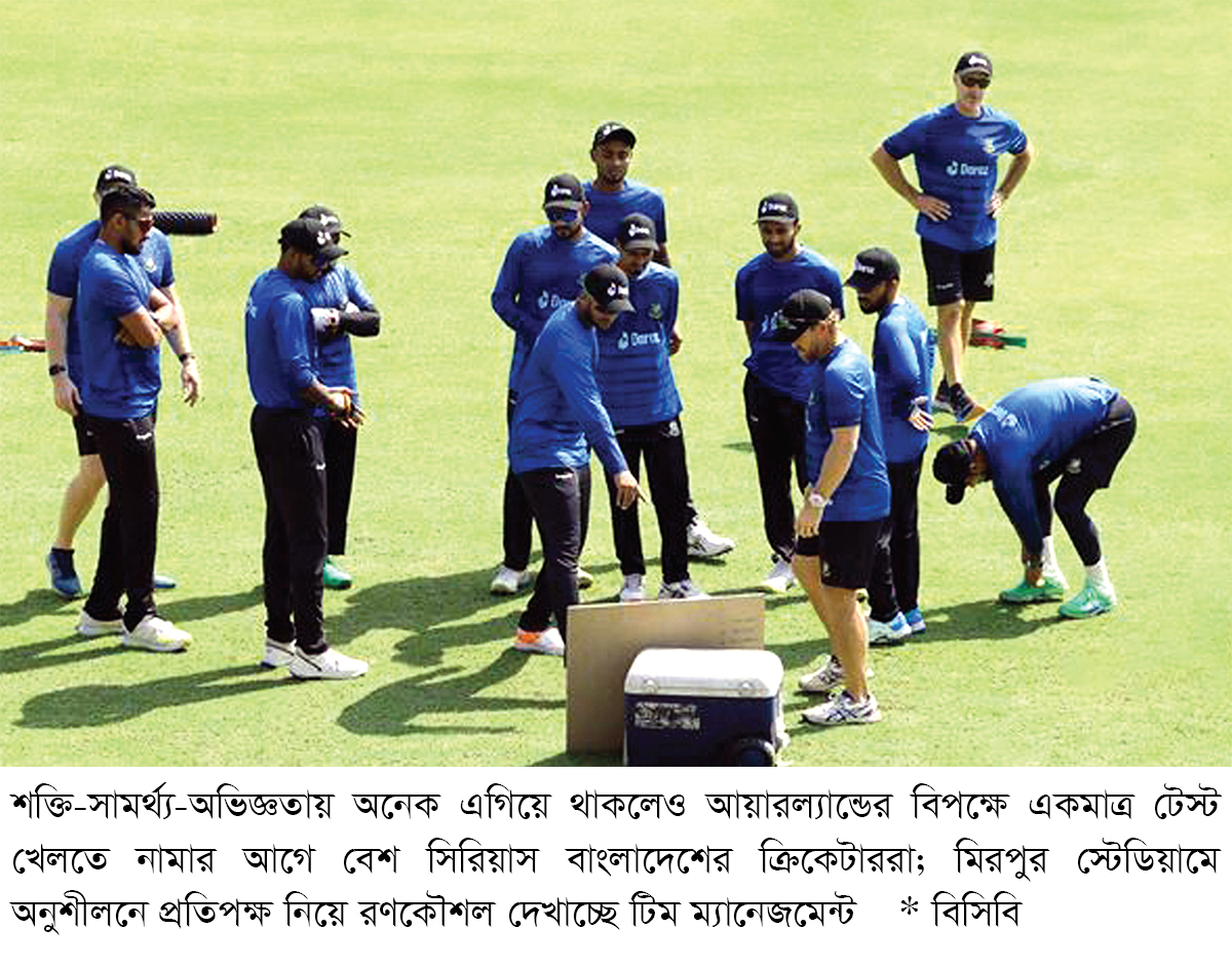 অনুশীলন শেষ করে দুই দলের ক্রিকেটাররা টিম হোটেলে ফিরে গেছে। চৈত্রের রোদের তেজ তখন কমতে শুরু করেছে। এর মাঝে মাঠকর্মীদের নিয়ে শুরু হলো কিউরেটর গামিনি সিলভার ব্যস্ততা। উইকেটের ওপর কাটা ঘাস ছড়িয়ে চালানো হলো রোলার। তাতে সবুজাভ ভাব যেন কিছুটা বাড়ল। আজ ম্যাচের দিন সকালে তা চমক হতে পারে দুই দলের জন্য। তবে এর আগে উইকেট দেখে বাংলাদেশ ও আয়ারল্যান্ডের ভাবনা অভিন্ন, ভালো উইকেটে হবে একমাত্র টেস্ট ম্যাচটি। একটা সময় মিরপুর স্টেডিয়ামে টেস্ট মানেই ছিল স্পিন স্বর্গে খেলা। প্রথম সেশন থেকে বল নিচু হওয়া, বড় বড় বাঁক খাওয়া বা অসম বাউন্স ছিল নিয়মিত চিত্র। স্পিনারদের দাপটে তিন-চার দিনে শেষ হতো যে কোনো ম্যাচ। সাদা বলের ক্রিকেটে সেখান থেকে বেরিয়ে ভালো উইকেটে খেলার বার্তা আগেই দিয়েছেন ওয়ানডে অধিনায়ক তামিম ইকবাল। এবার টেস্টেও মিলল তেমন কিছুর আভাস।