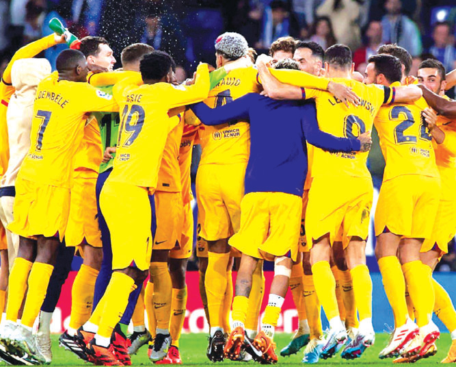 গত রোববার রাতে রবার্ট লেভানডভস্কির জোড়া গোলে এসপানিওলকে ৪-২ ব্যবধানে হারানোর পরেই ধরাছোঁয়ার বাইরে চলে যায় বার্সা। পয়েন্ট তালিকার দুইয়ে থাকা রিয়াল মাদ্রিদের সঙ্গে তাদের পয়েন্টের তফাত ১৪, যা ৪ ম্যাচ জিতলেও টপকাতে পারবে না রিয়াল। সে কারণে আগেভাগে চ্যাম্পিয়ন বার্সা। জয়ের নেপথ্যে বড় কারণ বার্সার এল ক্লাসিকো জয়। সেখানেই লিগের ফয়সালা অনেকটাই করে ফেলেন লেভানডভস্কিরা। ৩৪ ম্যাচে বার্সার পয়েন্ট ৮৫। সমান ম্যাচে ৭১ পয়েন্ট নিয়ে দুইয়ে রিয়াল।