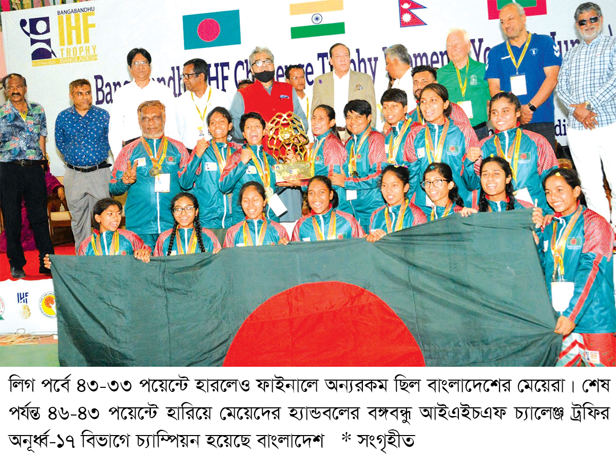 বঙ্গবন্ধু আইএইচএফ চ্যালেঞ্জ ট্রফি মেয়েদের হ্যান্ডবলের অনূর্ধ্ব-১৭ বিভাগে ভারতকে হারিয়ে চ্যাম্পিয়ন হয়েছে বাংলাদেশ। বুধবার শহীদ ক্যাপ্টেন এম মনসুর আলী জাতীয় হ্যান্ডবল স্টেডিয়ামে অনুষ্ঠিত ফাইনালে তারা ৪৬-৪৩ গোলে ভারতকে হারিয়ে শিরোপা জিতে নিয়েছে। জাতীয় ও বয়সভিত্তিক কোনো পর্যায়েই কখনোই এর আগে ভারতকে হারাতে পারেনি বাংলাদেশ। সাউথ-সেন্ট্রাল এশিয়া জোন-২ এ চ্যাম্পিয়ন হওয়ার সুবাদে বাংলাদেশ ইয়ুথ দল খেলবে এই টুর্নামেন্টের দ্বিতীয় রাউন্ডে।
