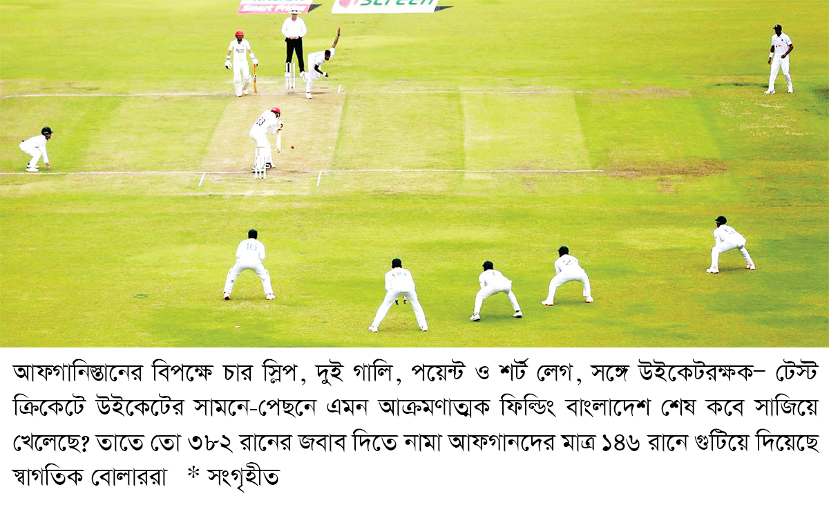 চার স্লিপ, দুই গালি, পয়েন্ট ও শর্ট লেগ, সঙ্গে উইকেটরক্ষক- টেস্ট ক্রিকেটে উইকেটের সামনে-পেছনে এমন আক্রমণাত্মক ফিল্ডিং বাংলাদেশের বোলিং ইনিংসে কখনো দেখেছেন? শুধু বাংলাদেশের বোলিং ইনিংসে কেন, মিরপুর স্টেডিয়ামে এমন দৃশ্যও বিরল। এমন দুর্লভ ক্যানভাসই গতকাল আঁকা হয়ে গেল বাংলাদেশ আফগানিস্তানের মধ্যকার টেস্টের দ্বিতীয় দিনের মধ্য দুপুরে।