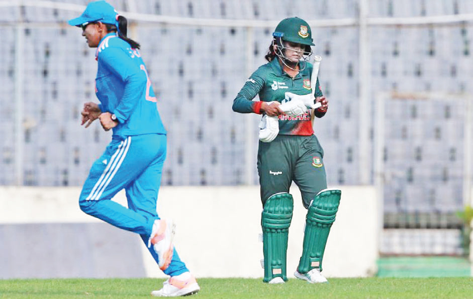 আগের ম্যাচেই শক্তিশালী ভারতকে ওয়ানডেতে প্রথমবারের মতো হারিয়ে ইতিহাস গড়েছিলেন বাংলাদেশের মেয়েরা। দ্বিতীয় ওয়ানডে জিতলেই দক্ষিণ এশিয়ার জায়ান্টদের বিপক্ষে প্রথমবার সিরিজ জয়ের রেকর্ড গড়া হতো। প্রথম ম্যাচ জয়ের পর অধিনায়ক নিগার সুলতানা জ্যোতির কণ্ঠেও ছিল ইতিহাস নতুন করে লেখার প্রত্যয়। তাতে আশায় বুক বেধেছিল ভক্তরা এবং সুযোগও ছিল অসাধারণ অর্জনে নিজেদের রাঙিয়ে নেওয়ার। কিন্তু আবারো সেই ব্যাটিং ব্যর্থতায় সেটির অপেক্ষা বাড়ল। বাংলাদেশকে দ্বিতীয় ম্যাচে চেনাই গেল না। জেমাইমা রদ্রিগুয়েজের অলরাউন্ডার পারফরম্যান্সে কোন জবাব দিতে পারলেন না নিগার সুলতানা জ্যোতিরা। বাংলাদেশকে সহজেই হারিয়ে সিরিজে সমতা এনেছে ভারত। গতকাল বুধবার মিরপুর শেরে বাংলা ক্রিকেট স্টেডিয়ামে বাংলাদেশের মেয়েদের ১০৮ রানের বড় ব্যবধানে হারায় সফরকারী ভারত। আগে ব্যাট করে ভারত করে ৮ উইকেটে ২২৮ রান। জবাব দিতে নেমে ৩ উইকেটে ১০৬ থেকে ১২০ রানে গুটিয়ে গেছে বাংলাদেশ। এই জয়ে তিন ম্যাচ সিরিজে ১-১ সমতা এনেছে সফরকারীরা। ব্যাটে-বলে বাংলাদেশকে ধসিয়ে দেওয়ার কারিগর জেমাইমা। ব্যাট হাতে ৭৮ বলে ৮৬ রান করার পর অফ স্পিনে ৩.১ ওভারে মাত্র ৩ রানে ৪ উইকেট নিয়েছেন তিনি। ২২৯ রান করে ম্যাচ জিততে রেকর্ড গড়তে হতো বাংলাদেশকে। কারণ এর আগে ২১০ রানের বেশি তাড়া করার নজির নেই। বড় লক্ষ্যে শুরু থেকেই তাই চাপে পড়ে যায় জ্যোতির দল। পাঁচ ওভারের মধ্যেই ফিরে যান দুই ওপেনার। চারে নামা লতা মন্ডল ১৪তম ওভারে আউট হলে ৩৮ রানে ৩ উইকেট হারায় স্বাগতিকরা। রানের মন্থর গতির সঙ্গে উইকেট হারিয়ে ব্যাকফুটে যাওয়া বাংলাদেশের মেয়েরা প্রতিরোধ গড়ে চতুর্থ উইকেটে। রিতু মনিকে নিয়ে ইনিংস মেরামতে নামেন ফারজানা হক পিংকি। দুজনের ৬৮ রানের জুটি ভাঙেন দেবিকা বিদ্যা। এর পরই যেন তাসের ঘর বাংলাদেশের ইনিংস। অনিয়মিত বোলার হিসেবে বল করতে এসে একের পর এক উইকেট তুলতে থাকেন জেমাইমা। পিংকির ৮১ বলে ৪৭ রানের পর দ্বিতীয় সর্বোচ্চ রিতু মনির ২৭। পুরো ইনিংসে আর একজনই পেরেছেন দুই অঙ্ক পেরুতে। ওপেনার মুরশিদা খাতুন করেছিলেন ১২ রান। অধিনায়ক জ্যোতিসহ বাকিরা ছিলেন যাওয়া আসার মিছিলে। ১০৬ থেকে ১২০, স্রেফ ১৪ রানের মধ্যে ৭ উইকেট হারিয়ে প্রায় ১৫ ওভার আগেই গুটিয়ে যায় বাংলাদেশ। এর আগে টস হেরে ব্যাট করতে নামা ভারতের ইনিংসে পঞ্চম ওভারে আঘাত হেনেছিলেন মারুফা আক্তার। দারুণ ইনস্যুইঙ্গারে বোল্ড করে দিয়েছিলেন প্রিয়া পুনিয়াকে। পরে স্বস্তিকা ভাটিয়াকে রান আউট করে দলকে ভালো শুরু পাইয়ে দিয়েছিলেন তিনি। যদিও স্মৃতি মান্ধানা, হারমানপ্রিত কাউর আর জেমাইমার ব্যাটে চাপ জারি রাখা যায়নি। ওপেনার স্মৃতি ৩৬ রান করে আউট হলেও ফিফটি আসে 
