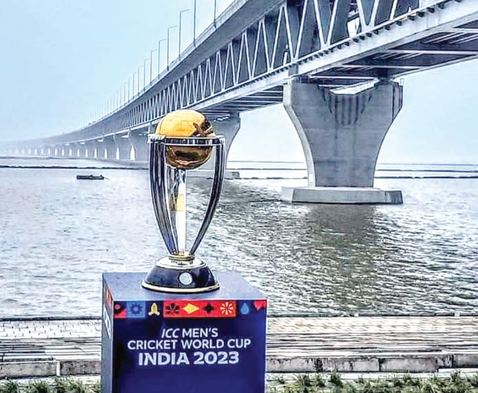 পদ্মা সেতু কেবল যোগাযোগের মাধ্যমই নয়, এটা বাংলাদেশিদের জন্য আবেগ ও ভালোবাসার নাম। অনেক বাধা-বিপত্তি পেরিয়ে তেরি হয়েছে স্বপ্নের এই সেতু। স্বাভাবিকভাবেই দেশের অন্যতম সেরা স্থাপনা। আর সেই স্থাপনাতেই হলো আইসিসি বিশ্বকাপ ট্রফির ফটোসেশন। বিশ্বকাপ শুরুর আগে প্রতিবারই বিশ্ব ভ্রমণে বের হয় ট্রফি। তারই অংশ হিসেবে মহাকাশ থেকে শুরু হয়েছে এবারের ওয়ার্ল্ড কাপ ট্রফি ট্যুর। গত রোববার মধ্যরাতে বাংলাদেশে এসেছে ওয়ানডে বিশ্বকাপের ট্রফি। গতকাল সোমবার পদ্মা সেতুতে ফটোসেশনের মধ্যদিয়ে শুরু হয়েছে বাংলাদেশে আইসিসি ট্রফির তিন দিনের ট্যুর। বিকাল ৩টার দিকে হেলিকপ্টারে করে আইসিসি বিশ্বকাপ ট্রফি পদ্মা সেতুর মাওয়া প্রান্তের পদ্মা সেতু প্রকল্পের ১ নম্বর সার্ভিস এরিয়াতে নেয়ার কথা ছিল। তবে বৈরী আবহাওয়ার কারণে সড়কপথে বিকাল সাড়ে ৪টার দিকে ট্রফি নিয়ে আসা হয় পদ্মা সেতুর ১ নম্বর পিলার সংলগ্ন এলাকায়। সেখানে প্রমত্তা পদ্মার তীরে স্বপ্নের পদ্মা সেতুকে ঘিরে চলে আইসিসি ওয়ানডে বিশ্বকাপ ট্রফির অফিশিয়াল ফটোসেশন। এ সময় আইসিসি ও বাংলাদেশ ক্রিকেট বোর্ডের ঊর্ধ্বতন কর্মকর্তারা উপস্থিত ছিলেন। ফটোসেশন ঘিরে পদ্মা সেতুর মাওয়া প্রান্তে উৎসবের আমেজ বিরাজ করে। আইসিসির রীতি অনুযায়ী কোনো একটা বিশেষ স্থানে বা স্থাপনার সামনে বিশ্বকাপের ট্রফি নিয়ে ফটোসেশন করার রীতি আছে। এর আগেরবার জাতীয় সংসদ ভবনের সামনে ট্রফির ফটোসেশন করা হয়েছিল। এবার বেছে নেওয়া হয় পদ্মা সেতুকে। কেন না, গত বছরের ২৫ জুন উদ্বোধন হওয়া ৬ দশমিক ১৫ কিলোমিটার দীর্ঘ পদ্মা সেতু এখন দেশের অন্যতম একটি আইকনিক স্থাপনা ও গর্বের প্রতীক। সে কারণে পদ্মা সেতুতে এবার আইসিসি বিশ্বকাপ ট্রফির ফটোসেশন করা হয়েছে বলে জানিয়েছে আয়োজকরা। আজ মিরপুর শেরেবাংলা জাতীয় স্টেডিয়ামে সকাল ৯টা থেকে দুপুর ১২টা পর্যন্ত জাতীয় দল, নারী জাতীয় দল, সাবেক-বর্তমান ক্রিকেটার, ক্রিকেট সংশ্লিষ্ট কর্মকর্তা, আয়োজক ও মিডিয়ার জন্য উন্মুক্ত থাকবে ট্রফি।