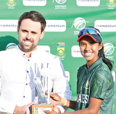 দক্ষিণ আফ্রিকার মাটিতে প্রথমবার জয়ের স্বাদ পেয়েছে বাংলাদেশের মেয়েরা। গত রোববার বেনোনিতে সিরিজের প্রথম টি-টোয়েন্টিতে প্রোটিয়াদের ১৩ রানে হারিয়েছে টাইগ্রেসরা। জয়ের নায়ক লেগ স্পিনিং অলরাউন্ডার স্বর্ণা আক্তার। ক্যারিয়ার সেরা বোলিংয়ে প্রথমবারের মতো তিনি ৫ উইকেট শিকার করেন। ২০ ওভারে বাংলাদেশ ২ উইকেটে করে ১৪৯ রান। বাংলাদেশের হয়ে ব্যাট হাতে বড় অবদান রাখেন মুর্শিদা খাতুন। ৫৯ বলে ৬ চার ও এক ছক্কায় অপরাজিত ৬২ রান করেন তিনি। ২১ বলে ৬ চারে অপরাজিত ৩৪ রানের ঝড়ো ইনিংস খেলেন অধিনায়ক নিগার সুলতানা। জবাবে শক্ত অবস্থানে থেকে পথ হারিয়ে দক্ষিণ আফ্রিকা করতে পারে ৮ উইকেটে ১৩৬। যদিও বোলিংয়ে শুরুটা ভালো করতে পারেননি মারুফা আক্তার, নাহিদা আক্তাররা। আনেকা বোশ ও টাজমিন ব্রিটসের আগ্রাসী ব্যাটিংয়ে পাওয়ার প্লেতে ৫৪ রান তুলে ফেলে দক্ষিণ আফ্রিকা। দশম ওভারে ব্রিটসকে (২৬ বলে ৩০) ফিরিয়ে ৬৯ রানের শুরুর জুটি ভাঙেন লেগ স্পিনার রাবেয়া খান। পরের ওভারে আরেকটি সাফল্য আসে ফাহিমা খাতুনের হাত ধরে। ৮ উইকেট হাতে রেখে শেষ ৫ ওভারে দক্ষিণ আফ্রিকার দরকার ছিল ৪৯ রান। ৪১ বলে ফিফটি করে খেলছিলেন আনেকা। ষোড়শ ওভারে সুনে লুসকে ফিরিয়ে প্রথম শিকার ধরেন স্বর্ণা। তার পরের ওভারে আরো দুই উইকেটের পতনে বদলে যায় ম্যাচের চিত্র। এই ওভারেই দক্ষিণ আফ্রিকার বড় ভরসা আনেকা বিদায় নেন ৪৯ বলে ৬৭ রান করে। তারা ম্যাচ থেকেও ছিটকে যায় সেখানেই। শেষ ওভারে ২৪ রানের সমীকরণে স্বর্ণার প্রথম বলে চার মারেন ডেলমি টাকার। তবে স্বর্ণা ঘুরে দাঁড়ান দারুণভাবে। তৃতীয় ও চতুর্থ বলে মিকি ডি রিডার ও মাসাবাতা ক্লাসকে ফিরিয়ে ৫ উইকেট পূর্ণ করেন ১৬ বছর বয়সি স্পিনার। জাহানারা আলম, পান্না ঘোষ ও নাহিদার পর বাংলাদেশের চতুর্থ ক্রিকেটার হিসেবে মেয়েদের টি-টোয়েন্টিতে ৫ উইকেটের স্বাদ পেলেন স্বর্ণা। ম্যাচসেরা অবধারিতভাবে তিনিই।