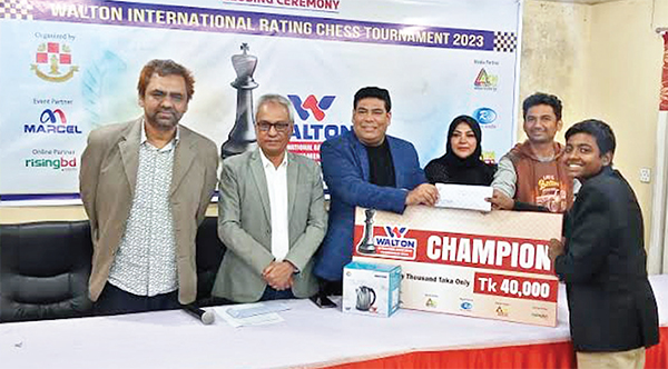 অনেক নাটকীয়তা আর টাইব্রেকিংয়ের পর ওয়ালটন আন্তর্জাতিক রেটিং দাবার শিরোপা জিতে নিয়েছেন ক্যান্ডিডেট মাস্টার সাকলাই মোস্তফা সাজিদ। দুই গ্র্যান্ডমাস্টার জিয়াউর রহমান ও রিফাত বিন সাত্তার, আন্তর্জাতিক মাস্টার ও ফিদে মাস্টারদের পেছনে ফেলে শিরোপা জিতে চমক দিলেন সাকলাইন। কদিন আগেও জুনিয়র চ্যাম্পিয়নশিপের শিরোপাও জিতেছেন তিনি। শুক্রবার জাতীয় ক্রীড়া পরিষদের দাবাকক্ষে অনুষ্ঠিত নবম রাউন্ড শেষে সাত পয়েন্ট করে নিয়ে গ্র্যান্ডমাস্টার জিয়া ও সাকলাইন সমান অবস্থায় ছিলেন। কিন্তু টাইব্রেকিং সিস্টেমে জিয়াকে পেছনে ফেলে চ্যাম্পিয়ন হন ১৩ বছর বয়সী এই ক্যান্ডিডেট মাস্টার। জাতীয় চ্যাম্পিয়নশিপের পর আন্তর্জাতিক রেটিং দাবার শিরোপা জয়। ক’দিনের মাথায় দুটি ট্রফি জেতা সাকলাইনের কাছে দুইরকমই মনে হচ্ছে, ‘দুই টুর্নামেন্টে শিরোপা জেতার আনন্দ দুইরকম। জুনিয়র টুর্নামেন্টটা জাতীয় পর্যায়ে সেটার স্বাদ এক রকম। এটি রেটিং টুর্নামেন্ট হলেও দুই জিএম, আইএম আরো অনেক বড় দাবাড়ুরা খেলেছেন।