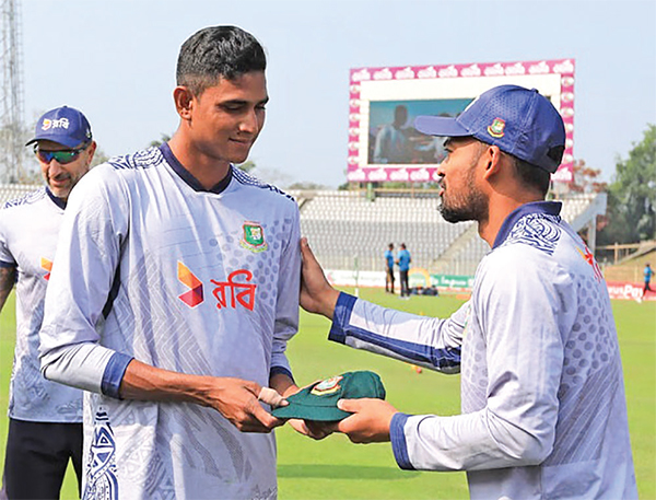 সিলেট আন্তর্জাতিক ক্রিকেট স্টেডিয়ামে বাংলাদেশের ১০৩তম ক্রিকেটার হিসেবে টেস্ট অভিষেক হয়েছে নাহিদ রানার। গতকাল শুক্রবার অধিনায়ক নাজমুল হোসেন শান্ত তার হাতে তুলে দেন কাঙ্ক্ষিত টেস্ট ক্যাপ। শ্রীলঙ্কার বিপক্ষে টেস্ট আঙিনায় পা রেখেই তিন উইকেট শিকার করেন তিনি। তরুণ এই পেসার টেস্ট দলে ডাক পাওয়ার প্রতিক্রিয়ায় বলেছিলেন গতি আর বাউন্স দিয়ে প্রতিপক্ষকে ভড়কে দিতে চান। যে কথা সেই কাজ। অভিষেক টেস্ট খেলতে নামা নাহিদ রানা শুরুর দিকে এলোমেলো বোলিংয়ে দেদারসে রান দিলেও শেষ বেলায় ভয়ঙ্কর হয়ে উঠলেন। তরুণ এই পেসারের তোপেই শেষ পর্যন্ত বেশিদূর এগোতে পারল না সফরকারীরা। ৬৮ ওভার ব্যাট করে ২৮০ রানে থেমেছে লঙ্কানদের ইনিংস। সমান ১০২ রানের ইনিংস খেলেছেন ডি সিলভা ও কামিন্দু মেন্ডিস। সিলেটে এসে দলের দুই দিনের অনুশীলনে দারুণ গতি আর আগ্রাসন দিয়ে জয় করেন কোচের মন।