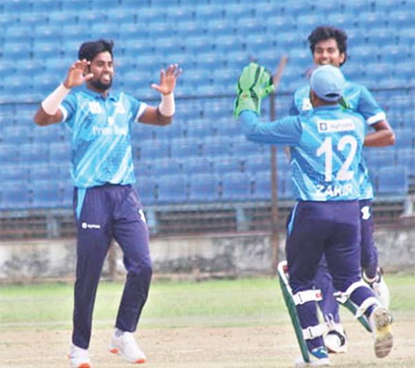 দুই ম্যাচ হাতে রেখেই ঢাকা প্রিমিয়ার লিগের (ডিপিএল) শিরোপা নিশ্চিত করেছিল আবাহনী লিমিটেড। তবুও দৃষ্টি ছিল ‘স্কাই ব্লুদে’র উপর। শেষ পর্যন্ত অপরাজিত থাকতে পারে কি না তারা। শেষ ম্যাচে শাইনপুকুর ক্রিকেট ক্লাবকে হারিয়ে অপরাজিত চ্যাম্পিয়নই হয়েছে ঐতিহ্যবাহী দলটি। তবে শেষ দিনে সব আলো কেড়ে নিয়েছেন প্রাইম ব্যাংক ক্রিকেট ক্লাবের রেজাউর রহমান রাজা। দেশের লিস্ট ‘এ’ ক্রিকেটে এক ম্যাচে সর্বাধিক উইকেট নেয়ার নজির গড়েছেন এই তরুণ। গতকাল রোববার ফতুল্লার খান সাহেব ওসমান আলি স্টেডিয়ামে শেখ জামাল ধানমন্ডি ক্লাবের বিপক্ষে আগুন ঝরানো বোলিং করেন রাজা। ৬.৩ ওভার বল করেই ২৩ রানের খরচায় নিয়েছেন আটটি উইকেট। এই বোলিং ফিগার দেশের লিস্ট ‘এ’ ক্রিকেটের ইতিহাসের সেরা। তার রেকর্ডগড়া বোলিংয়ে মাত্র ৭১ রানে গুটিয়ে যায় শেখ জামাল। ফলে ১৯৯ রানের বিশাল জয় পায় প্রাইম ব্যাংক। এর আগে এত দিন এই রেকর্ডটি ছিল ইয়াসিন আরাফাতের। ২০১৮ সালে আবাহনী লিমিটেডের বিপক্ষে গাজী গ্রুপ ক্রিকেটার্সের হয়ে খেলতে নেমে ৪০ রানে ৮ উইকেট নিয়েছিলেন এই পেসার। এদিন তাকে ছাপিয়ে নতুন কীর্তি গড়েন রাজা। সব মিলিয়ে লিস্ট ‘এ’ ক্রিকেটে এক ম্যাচে ৮ উইকেট নেয়া ১৭তম বোলার তিনি। এদিন ইনিংসের দশম ওভারে বোলিংয়ে আসেন এই পেসার। তখন শেখ জামালের সংগ্রহ ২ উইকেটে ১৯ রান। দুটি উইকেটই তখন পেসার হাসান মাহমুদের ঝুলিতে। এরপরের বাকি গল্প পুরোটাই রাজার। একাই তুলে নেন বাকি সব উইকেট। শুরুটা করেন ফজলে মাহমুদকে দিয়ে। প্রথম বলেই তাকে ফেরান রাজা। একই ওভারের শেষ বলে পান সাকিব আল হাসানের উইকেটও। পরের ওভারে ফিরেও জোড়া ধাক্কা দেন রাজা। প্রথম বলে নুরুল হাসান সোহানকে তুলে নেয়ার এক বল পর পান তাইবুর রহমানের উইকেট। আর নিজের তৃতীয় ওভারের শেষ বলে রিপন মন্ডলের স্টাম্প উড়িয়ে পূরণ করেন ফাইফার। এরপরও থামেননি। আবেদুর রহমান রাব্বি, ইয়াসির আলী চৌধুরী ও শফিকুল ইসলামকে তুলে নতুন এই রেকর্ড গড়েন এই পেসার। অন্যদিকে মিরপুর শেরে বাংলা জাতীয় ক্রিকেট স্টেডিয়ামে শাইনপুকুরকে ৪ উইকেটে হারিয়েছে আবাহনী। এনামুল হক বিজয়ের হার না মানা ১১০ রানের ইনিংসে ২৩ বল বাকি থাকতেই শাইনপুকুরের দেওয়া ২৩৫ রানের লক্ষ্যে পৌঁছায় চ্যাম্পিয়নরা। দিনের অপর ম্যাচে গাজী গ্রুপ ক্রিকেটার্সকে ৩ রানে হারিয়েছে মোহামেডান স্পোর্টিং ক্লাব। ৪৭.৩ ওভারে ১৭৬ রানে গুটিয়ে গিয়েছিল তারা। তবে বোলারদের সৌজন্যে ৩২.১ ওভারেই গাজী গ্রুপকে অলআউট করে দেয় মোহামেডান।